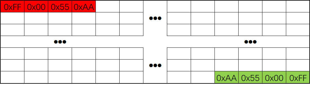 在存储器的寻址范围开始的N个字节存放固定的内容,以4个字节为例,如下图红色区域所示。 产品上电时首先读取前4个字节的内容,然后进行判断,如果内容和预期一致,就说明存储器中的数据是正确的数据,如果不一致,就说明存储器中的数据是异常数据。当检测到异常数据后,程序必须将前4个字节初始化为{0xFF,0x00,0x55,0xAA}(或者其它值),然后将产品配置数据存放在第5字节之后。