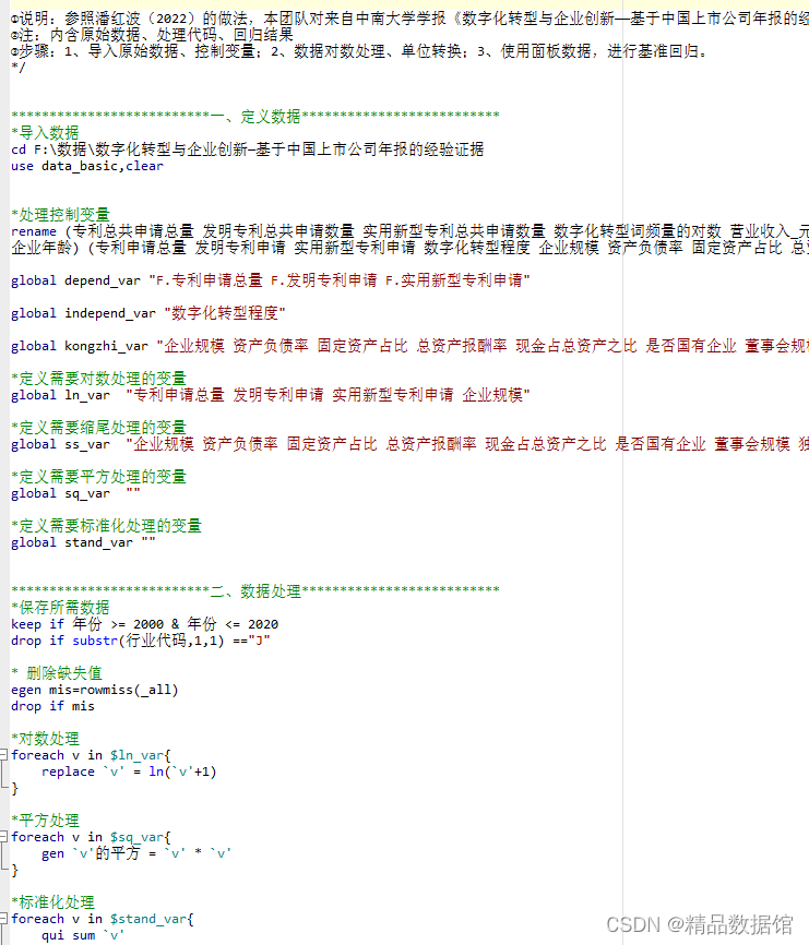 参照潘红波(2022)的做法,本团队对来自中南大学学报《数字化转型与企业创新——基于中国上市公司年报的经验证据》一文中的基准回归部分进行复刻。