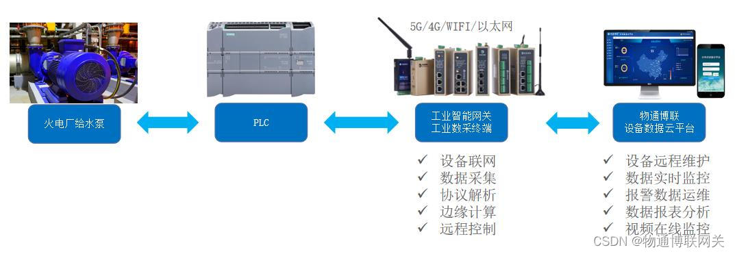 物通博联网关通过网口或串口与PLC连接,采集泵的运行状态,水位,压力,流量等信号以及摄像头,通过4G/5G/WiFi/以太网等方式上网,将数据传到泵站监控云平台(物通博联云、自开发云、阿里百度华为等第三方云平台),泵站管理人员可以在泵站监控中心远程监测站内水位或压力、泵组工作状态、出站流量、出站压力等,接收报警信息并及时控制。