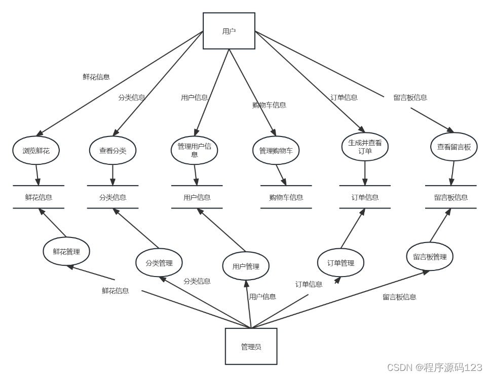 图2-1花言鲜花商城功能模块 2.1.3系统数据需求(数据流图) 根据各个模块之间的关系,可以粗略得出花言鲜花商城的数据流图,如图2-2所示: