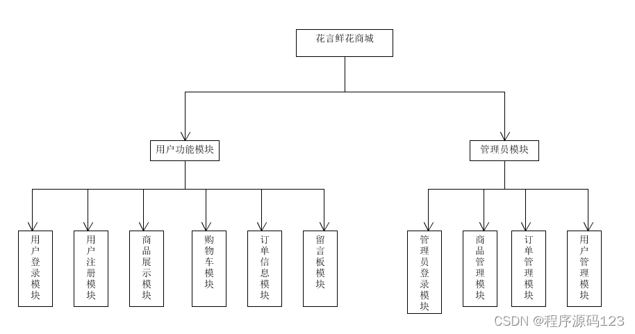| 2.1课题简要介绍 2.1.1功能需求模块描述 1、前台功能需求: (1)用户的登录:操作者可以选择自己的身份进行登录,消费者点击用户商城界面可以进入商城进行相应操作。 (2)管理员登录:后台管理员选择管理员登录可以进入后台进行相应操作。 (3)用户的注册:若用户没有注册,可点击注册进行注册,在注册过程中涉及到数据的合法性校验,用户名不能重复。 (4)商品展示模块:通过分页浏览商品,可以根据不同类别查看对应产品,也可以根据关键词搜索商品,没有库存的商品标记出来。 (5)购物车:用于存放用户的购物商品,用户也可根据自己的情况修改自己的购物车。 (6)订单模块:对于已经登录的用户可对购物车中的商品进行提交订单并且进行付款。 (7)留言板:方便顾客对于商品和网站提出意见。 2、后台功能需求: (1)管理员登录:管理员根据账户和密码进行登录 (2)商品管理:管理员可以对前台展示的商品信息进行分页查看(包括商品库存),添加,修改,删除,搜索等操作 (3)订单管理:管理员可以进行订单查看,删除,发货和搜索订单的操作,以及查看订单是否已经完成等订单详情。 (4)用户管理:管理员对注册的用户进行增删改查等操作。 2.1.2系统模块图 根据实际调查,花言鲜花商城主要有两大模块用户模块和管理员模块,以及相应的子模块,如图2-1所示: