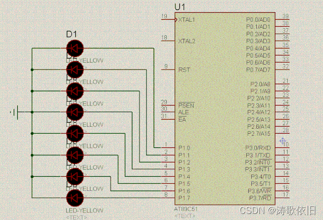 这个C程序很好理解,不需要过多解释。用Keil软件编译后,生成hex文件,然后塞入到如下单片机中,proteus仿真动图为: