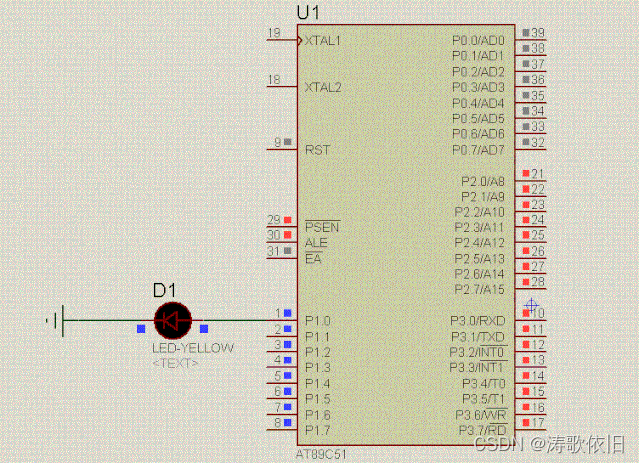 可以看到,D1的右端被程序设置为高电平,而左边是低电平,D1自然就亮了。用单片机点亮一个灯泡,是学习单片机的起点。