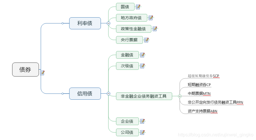 信用债没有国家背书,存在信用风险,包括:金融债、次级债、非金融企业债务融资工具、企业债、公司债。其中非金融企业债务融资工具包含:超级短期融资券(SCP)、短期融资券(CP)、中期票据(MTN)、非公开定向发行债务融资工具(PPN)、资产支持票据(ABN)。