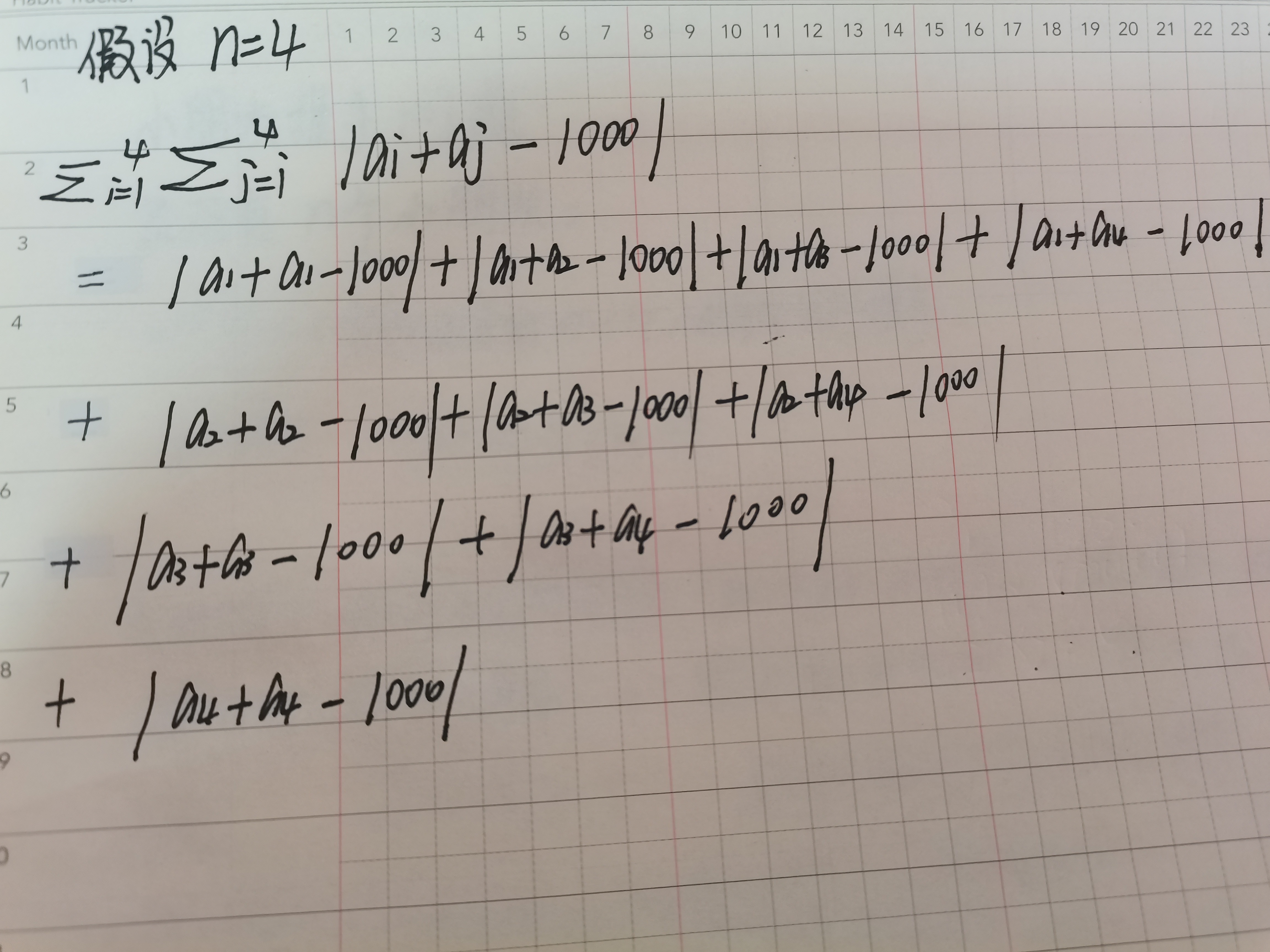 Σi=1nΣj=in∣ai+aj−1000∣\Sigma_{i=1}^{n} \Sigma_{j=i}^{n} |a_i+a_j-1000|Σi=1nΣj=in∣ai+aj−1000∣