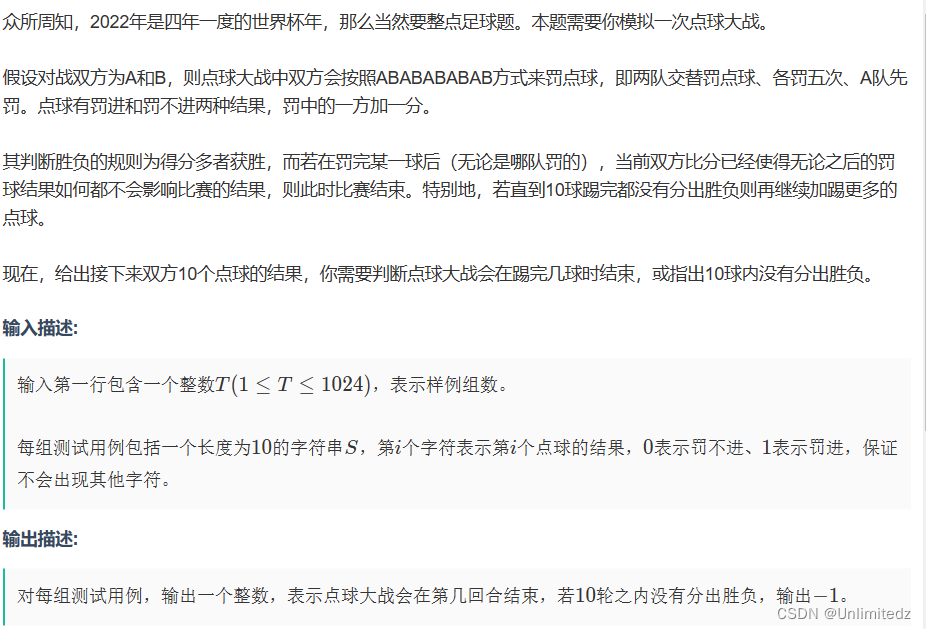 思路:感觉跟模拟差不多,按照题意来就行,每踢一球之后进行判断,停止比赛的条件为:a的进球数量大于b的进球数量+b的剩余场数,反过来b也可以大于a的。出现了这种情况就直接返回,否则跑到最后输出-1即可,表示没有输出胜负。
