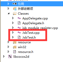 2:用VS2015打开win32工程,并在Classes目录下新建JsbTest.h和JsbTest.cpp文件,如下图所示: