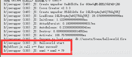 start () {// init logicthis.label.string = this.text;cc.log("Helloworld start");jsbTest.testLog();let num1: number = 23;let num2: number = 56;let sum: number = jsbTest.add(num1, num2);cc.log("num1 + num2 = " + sum);}