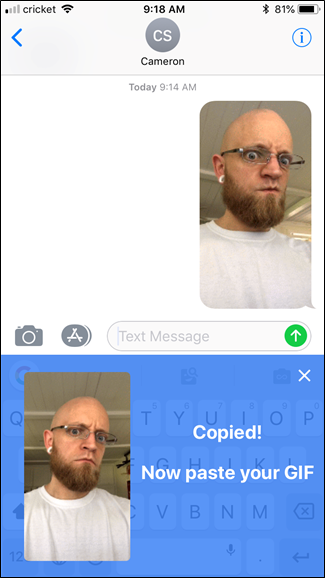 When you’ve finished recording, what happens next differs a bit in iOS and Android. In iOS, the GIF is copied to the clipboard and you have to paste it into a message manually.