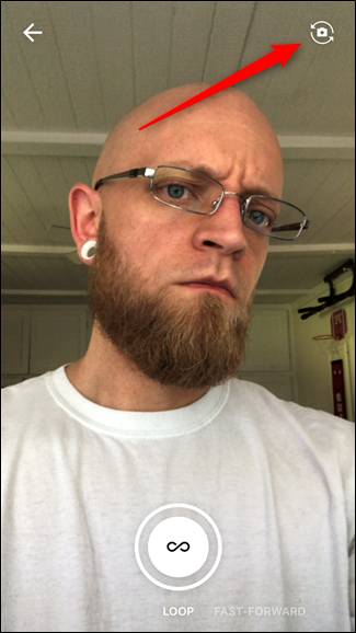 When this menu opens, tap the “Make A GIF” button, which will open the camera. You can use the rear or front-facing camera—just change it with the camera button (beside the shutter button on Android and in the top right corner on iOS).