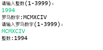 public class Test_0116 {public static void main(String[] args){System.out.println("请输入整数(1-3999):");Scanner sc1=new Scanner(System.in);int num =sc1.nextInt();Solution1 So1=new Solution1();if(num>0 && num<4000){String ret=So1.intToRoman(num);System.out.println("罗马数字:"+ret);}System.out.println("请输入罗马数字(1-3999):");Scanner sc2=new Scanner(System.in);String s =sc2.nextLine();Solution2 So2=new Solution2();int ret=So2.romanToInt(s);if(ret>0 && ret<4000){System.out.println("整数:"+ret);}}