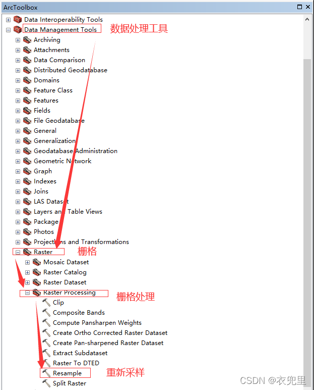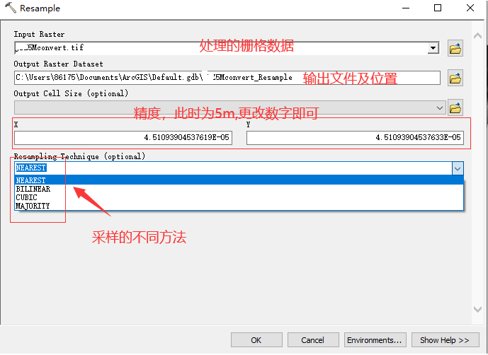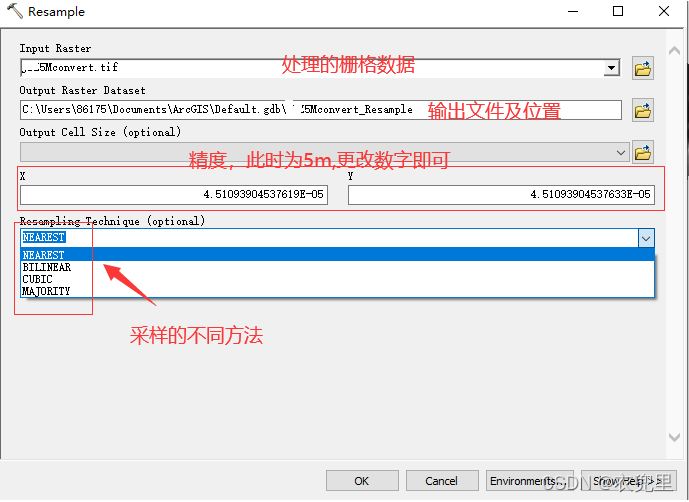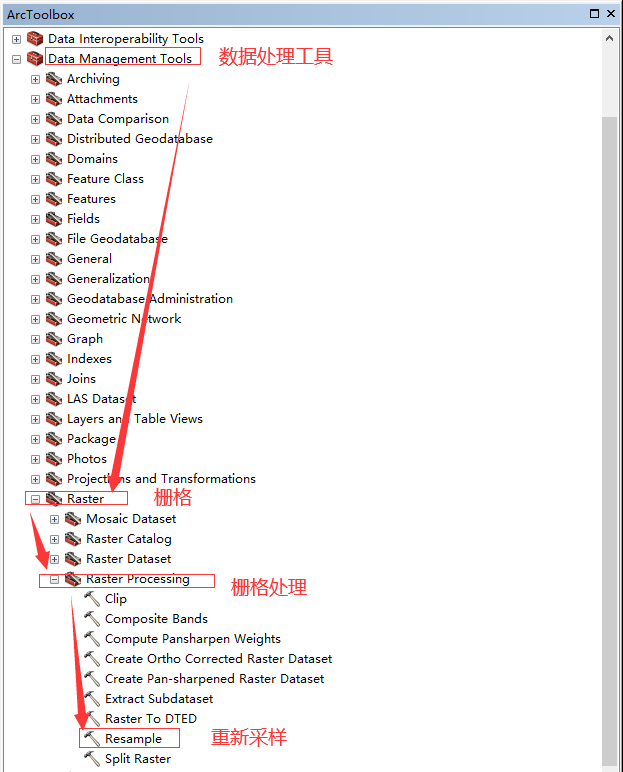 - 选择Arctoolbox下的data management tools工具,点击raster——raster processing——resample,打开tif文件,进行处理