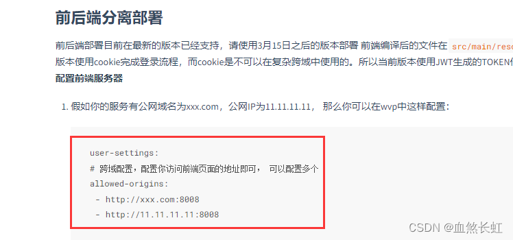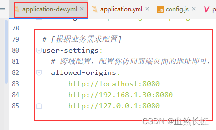 user-settings:# 跨域配置,配置你访问前端页面的地址即可, 可以配置多个allowed-origins:- http://localhost:8080- http://192.168.1.30:8080- http://127.0.0.1:8080