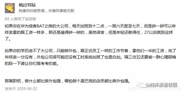 其实我们身边也有很多外包程序员,我身边也有从外包进一线互联网企业的例子,外包公司一般是中途培训上岗或者转行的,其实不管是不是外包,大家都是迫于生计,要不然谁想写代码对吧!