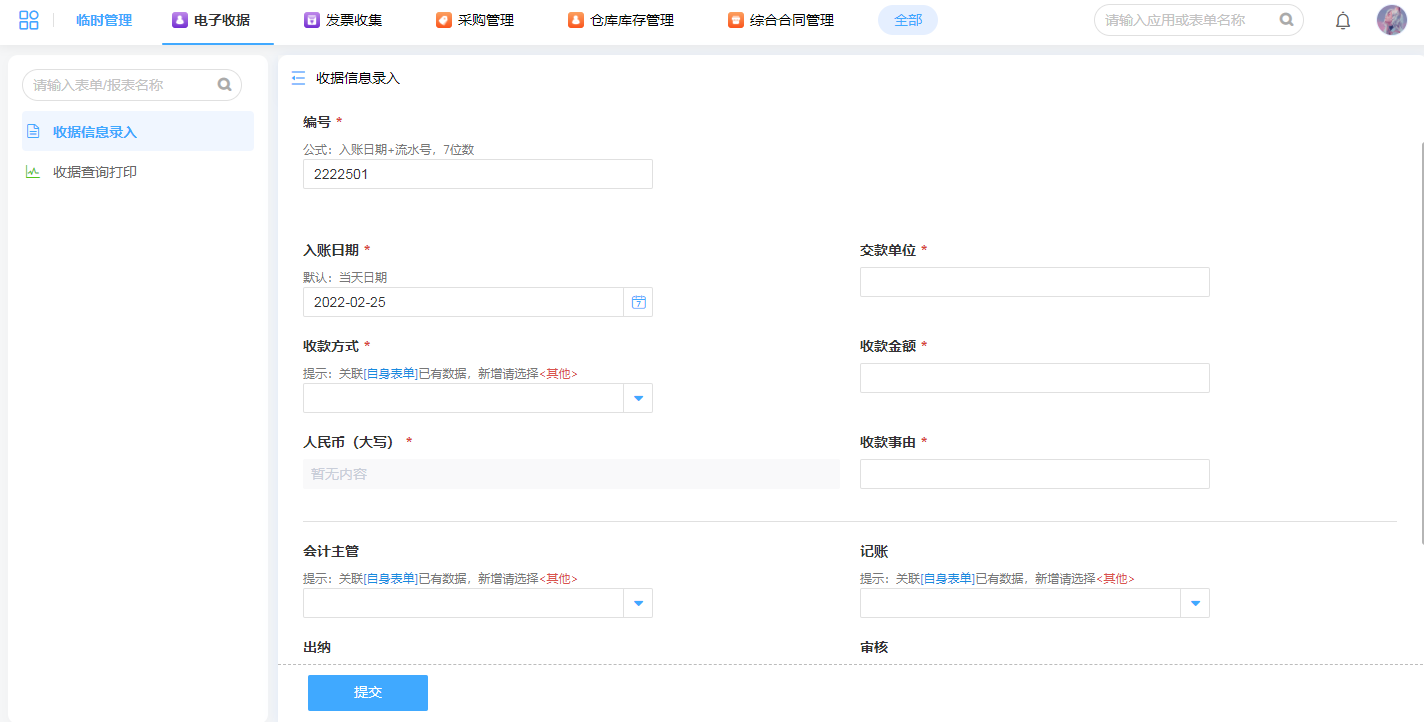 支持收据信息输入保存打印,大大提高开具收据效率。