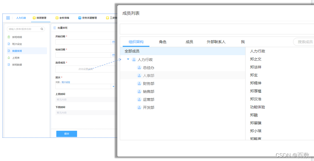 在需要同时操作多个部门或者多个成员的排班安排时,选择通讯录即可在直接勾选企业架构的各个部门以及成员,大大提升行政工作的效率。