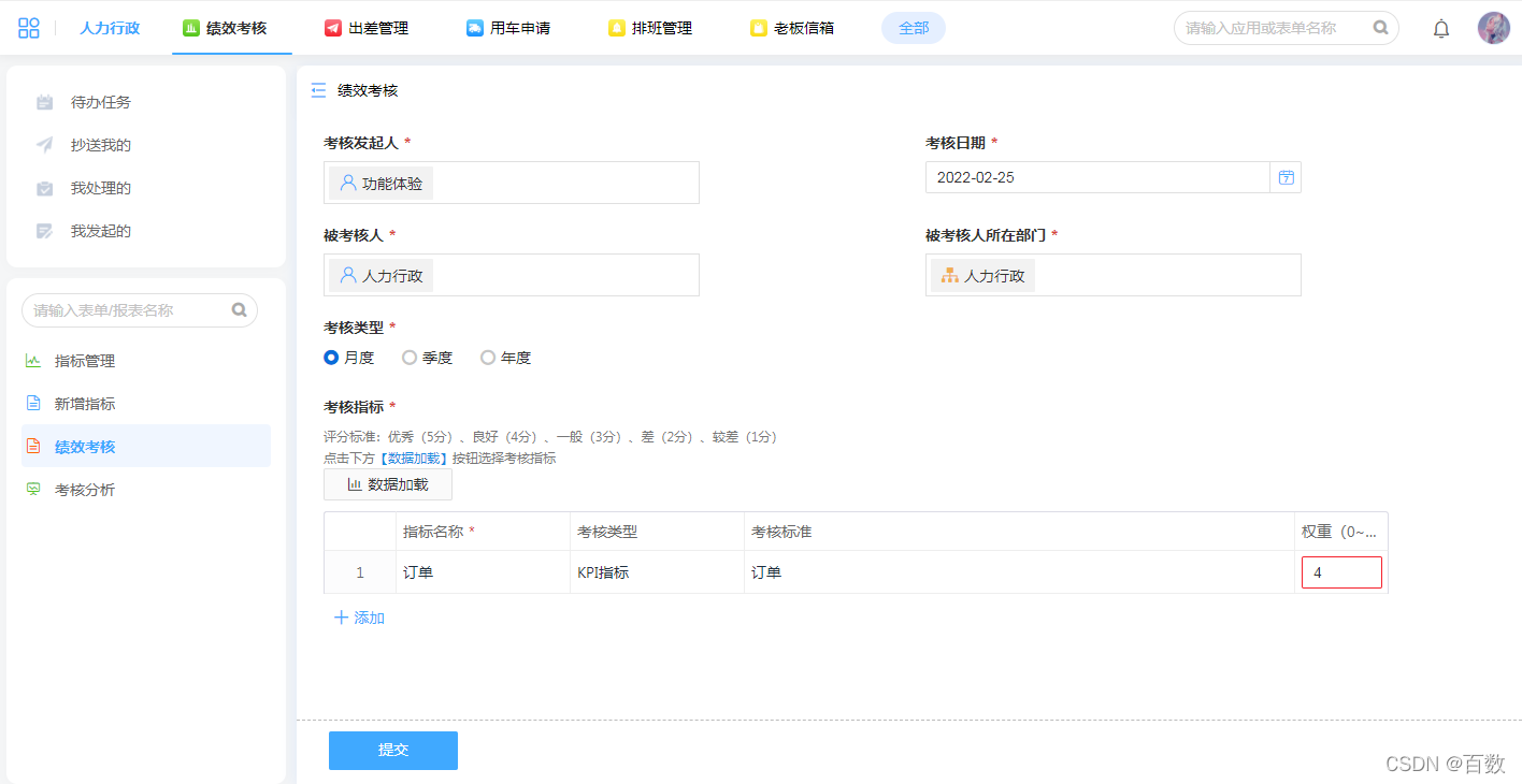 在绩效考核表单通过数据加载可以一键勾选考核指标,修改评分即可完成该指标下的考核判定。