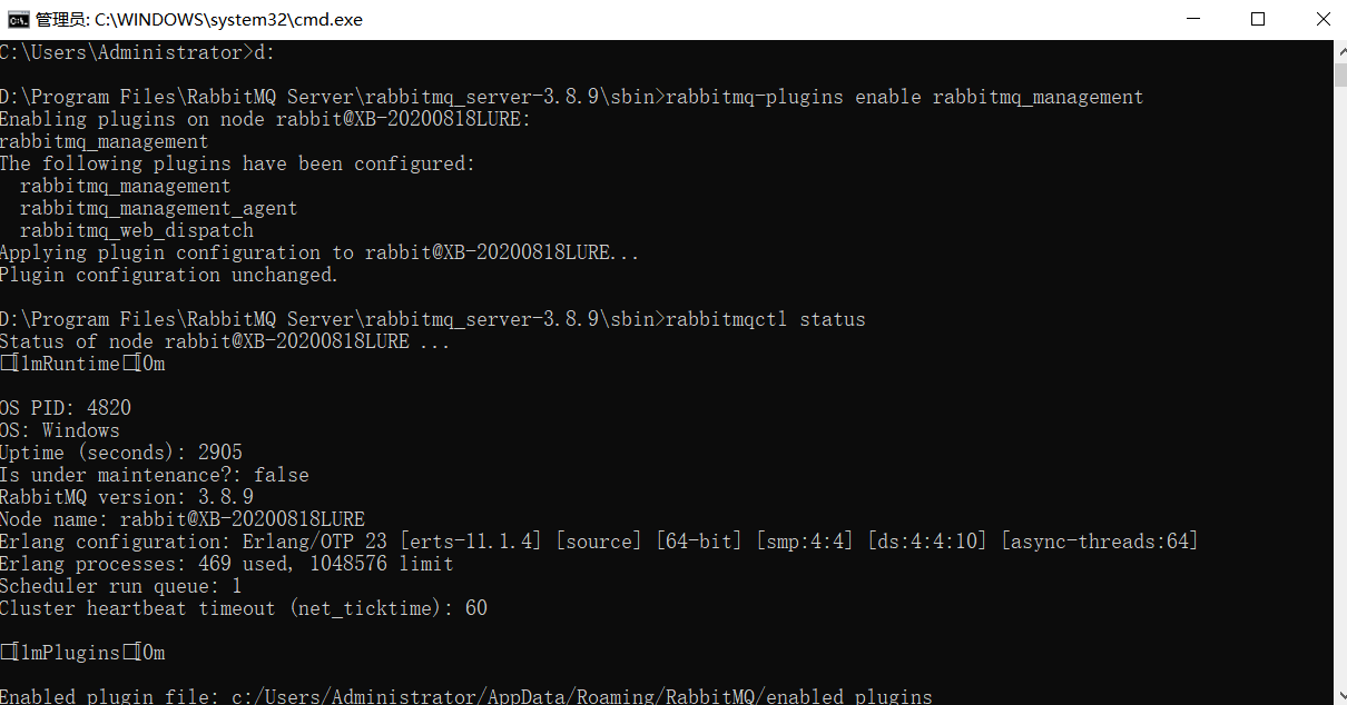 代码执行后,和我这输出的不一样的没关系,我这是安装好之后执行的,不报错就不用管。然后输入rabbitmqctl status检查是否安装成功