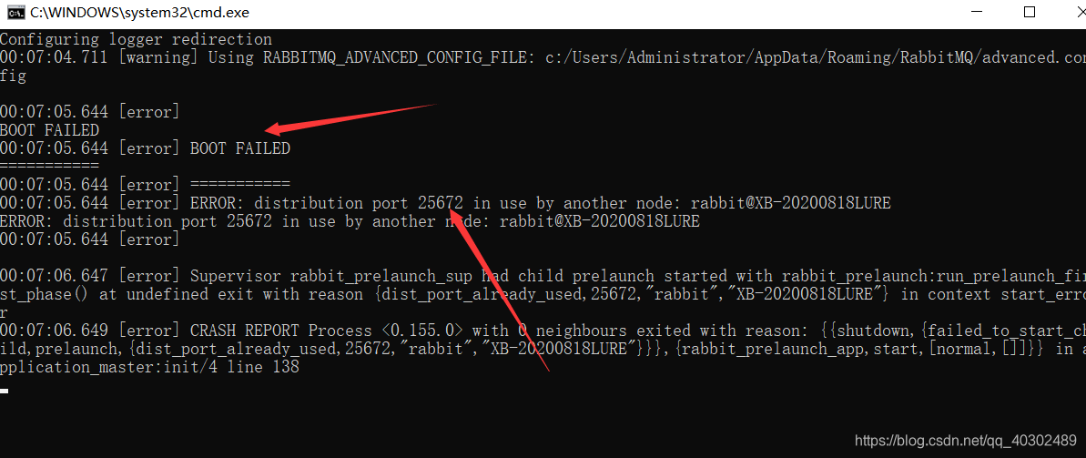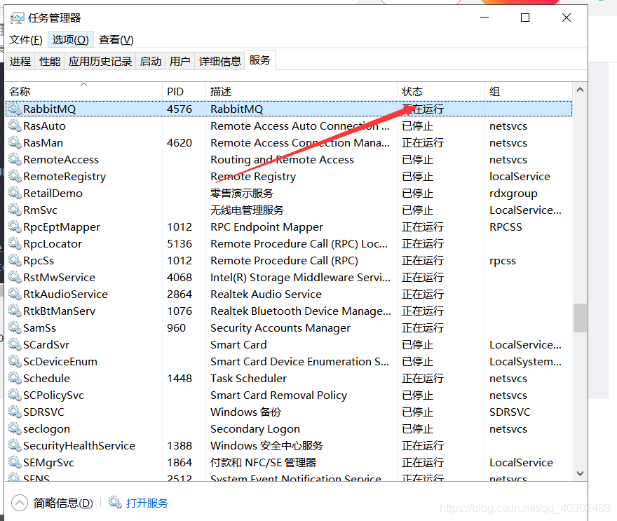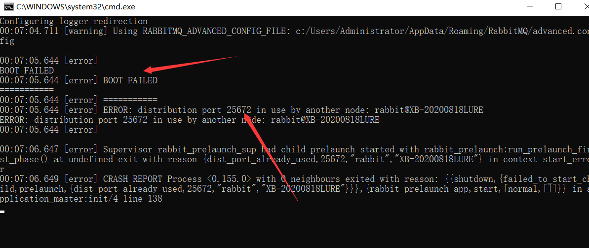 Configuring logger redirection 00:07:44.865 [warning] Using RABBITMQ_ADVANCED_CONFIG_FILE: c:/Users/Administrator/AppData/Roaming/RabbitMQ/advanced.config 00:07:45.778 [error]00:07:45.778 [error] BOOT FAILED BOOT FAILED 00:07:45.778 [error] =========== =========== 00:07:45.779 [error] ERROR: distribution port 25672 in use by another node: rabbit@XB-20200818LURE ERROR: distribution port 25672 in use by another node: rabbit@XB-20200818LURE 00:07:45.779 [error]00:07:46.768 [error] Supervisor rabbit_prelaunch_sup had child prelaunch started with rabbit_prelaunch:run_prelaunch_first_phase() at undefined exit with reason {dist_port_already_used,25672,"rabbit","XB-20200818LURE"} in context start_error 00:07:46.768 [error] CRASH REPORT Process <0.155.0> with 0 neighbours exited with reason: {{shutdown,{failed_to_start_child,prelaunch,{dist_port_already_used,25672,"rabbit","XB-20200818LURE"}}},{rabbit_prelaunch_app,start,[normal,[]]}} in application_master:init/4 line 138这是因为你的端口被占用了,或者说是你已经启动了rabbit mq ,去任务管理器找到服务 根据r字母搜索 rabbit mq就能看到他正在运行中