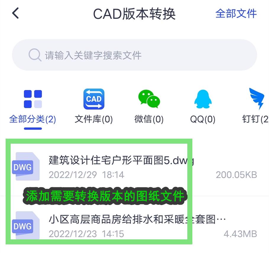 步骤三:点击开始转换之后会拉起移动设备的储存空间,在这里选中需要转换版本的图纸文件将其导入。