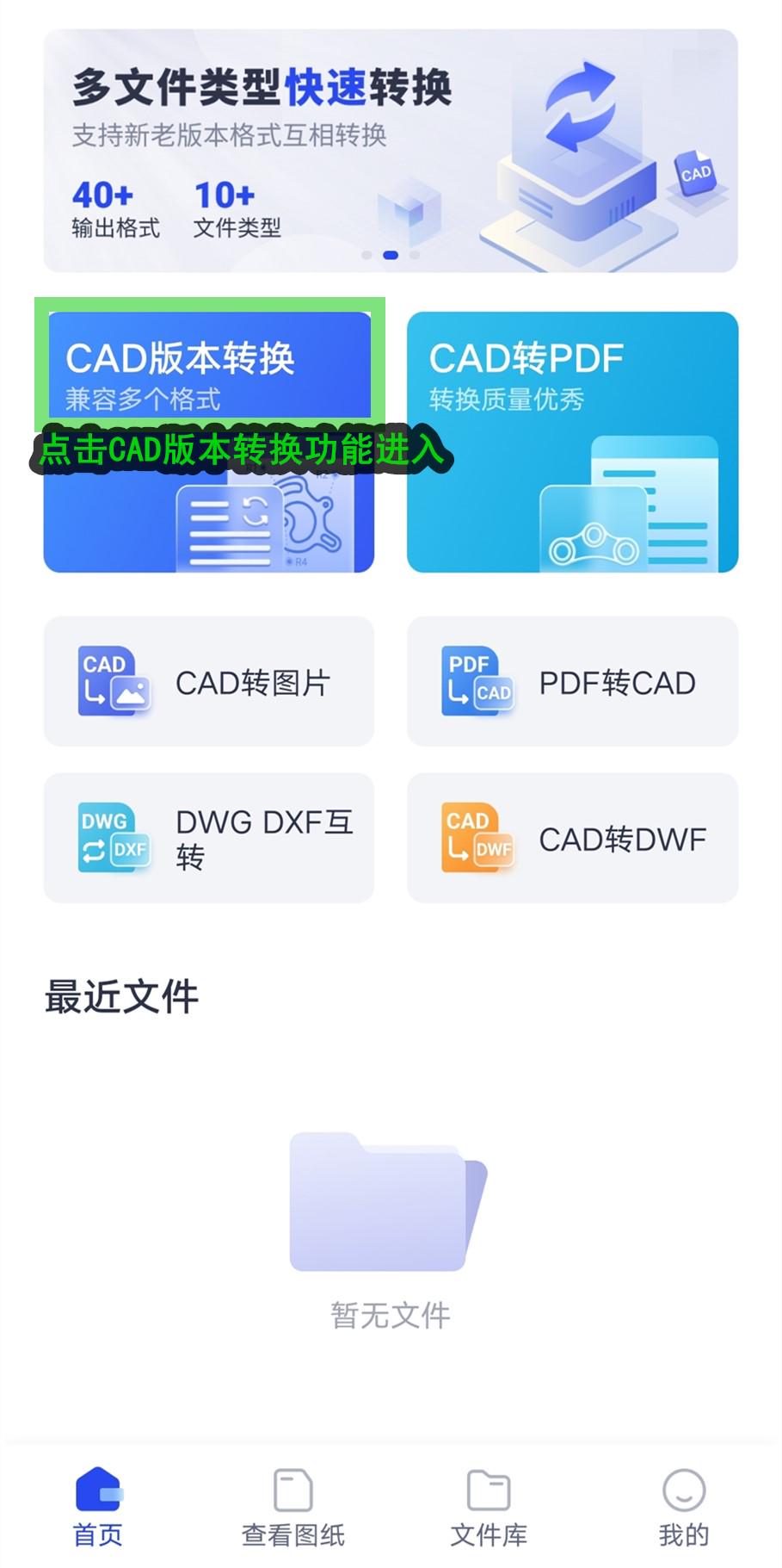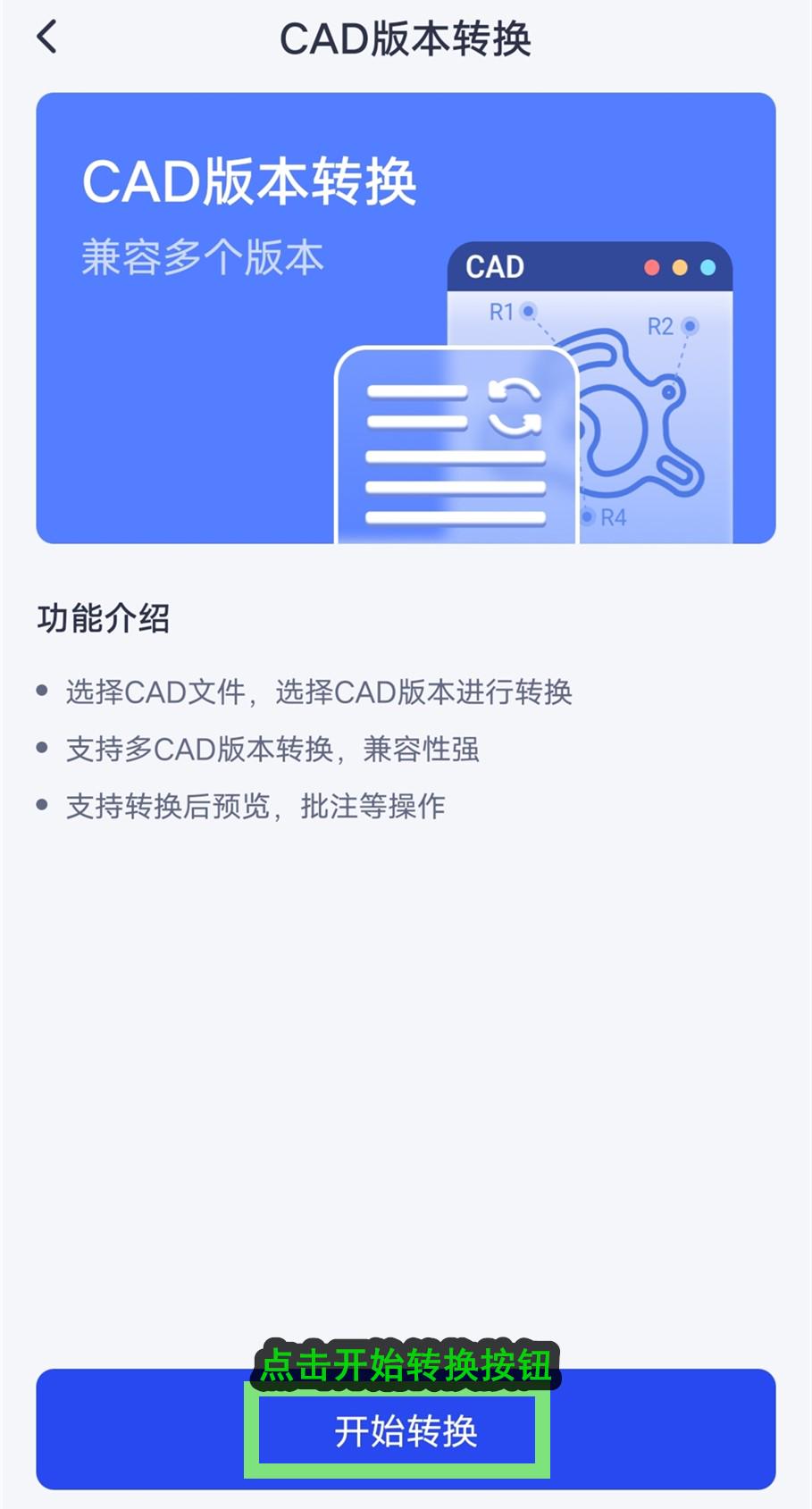 步骤一:首先在移动设备打开这款“迅捷CAD转换器”应用,接着在功能板块中点击“CAD版本转换”功能进入。