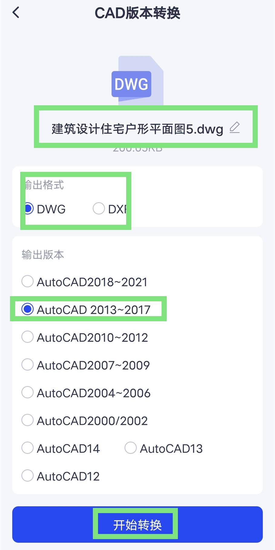 步骤四:文件导入进来之后根据需求可以考虑是否给文件更改名称便以区分。接着在下方输出格式中选择需要输出为DWG还是DXF格式的文件。设置完输出格式后可以在输出版本中选择需要转换的版本,最后点击下方的“开始转换”就可以完成图纸转换并保存到本地。是不是还挺方便的呢~
