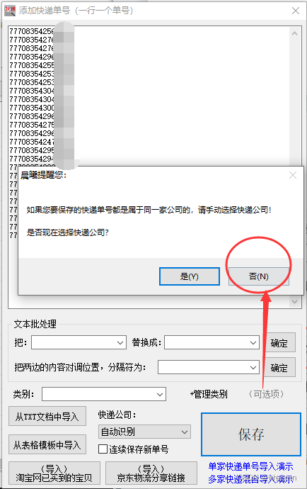 然后点击“保存”在弹出的提示框中选择“否”软件自动识别快递公司。