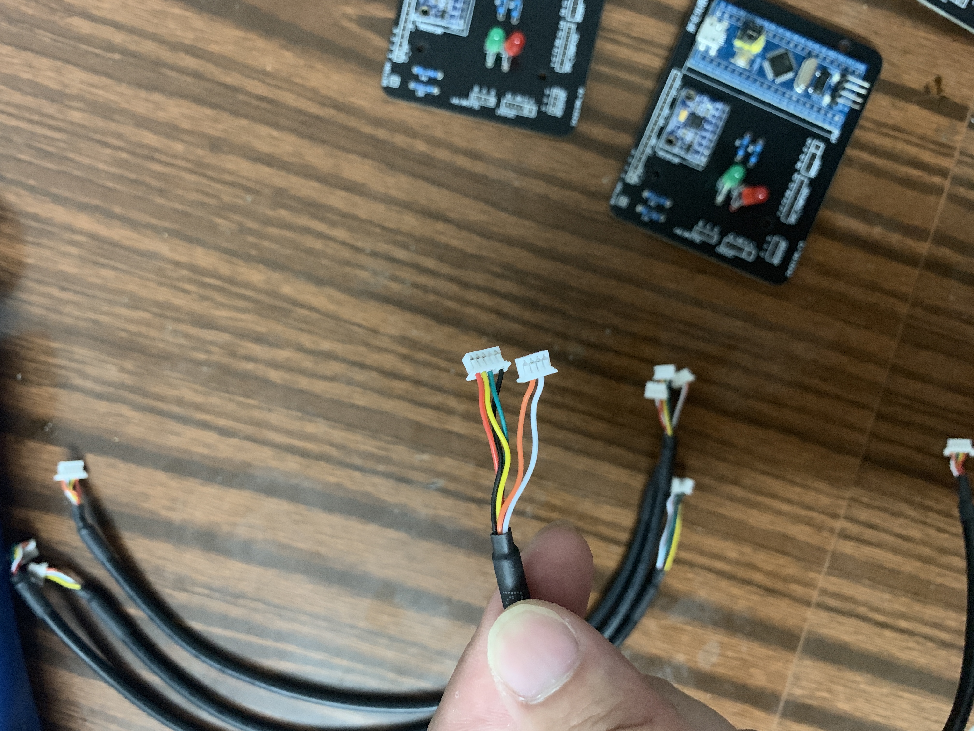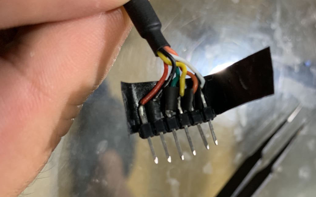 然后我们按照我之前博客上的顺序“红黑绿黄橙白”依次焊接到“V G TX RX CL DA”就行,与我之前照片不同的是这次是直接焊接到钻孔的焊盘上而不是排针上的,因此焊接应该更容易,还有一点,把线插入钻孔前建议先套好热缩管,焊完了再加热一下。