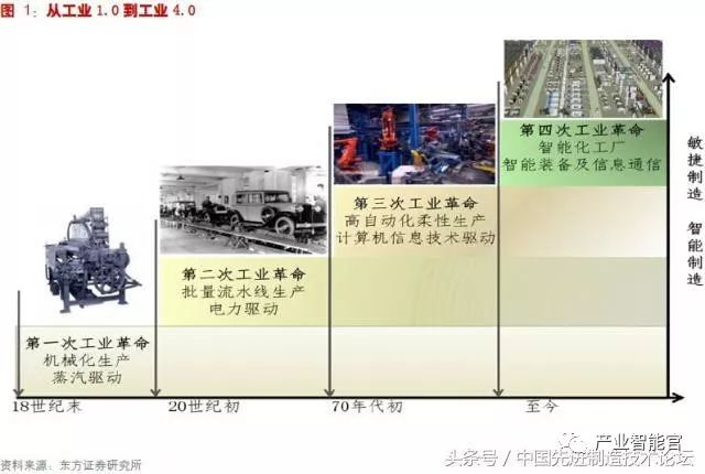 1)工业革命1.0:18 世纪末期始于英国的第一次工业革命,19 世纪中叶结束。这次工业革命的结果是机械生产代替了手工劳动,经济社会从以农业、手工业为基础转型到了以工业以及机械制造带动经济发展的模式。