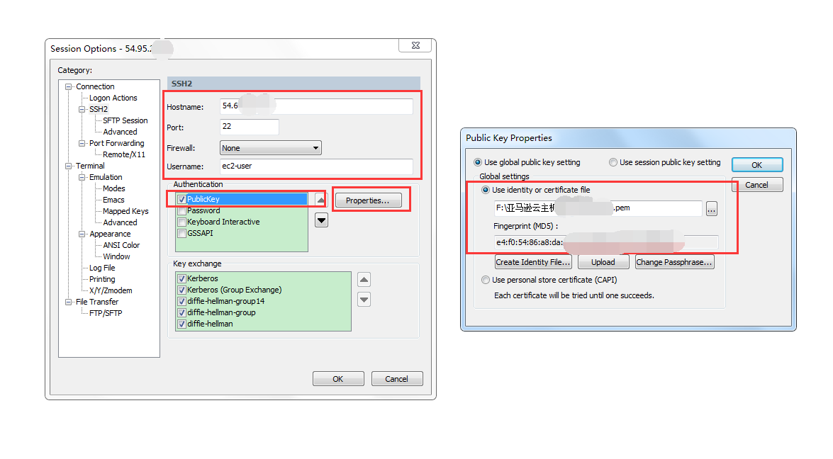 这里我使用的是SecureCRT客户端,但是很遗憾的是这个客户端如果不预先配置好,无法配置pem的秘钥。但是可以预先配置好久可以了,如下图: