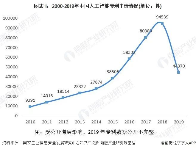 2018年,我国人工智能专利申请数量达到94539件,是2010年申请数量的10倍左右。2000-2019年,我国人工智能累计申请专利数超过44万件,位居全球第一。