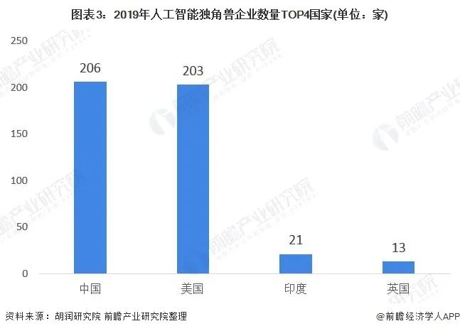 2019年,中国以206家人工智能独角兽企业位居全球人工智能独角兽企业数量TOP4国家榜单榜首。这也成为了国际上更加看好未来中国人工智能产业发展的原因之一。