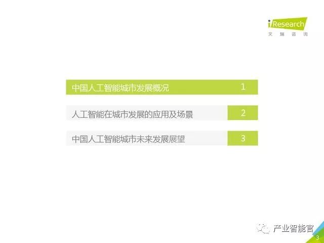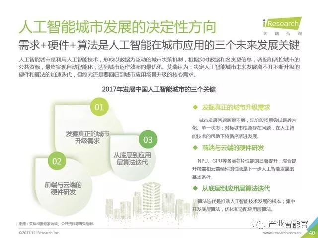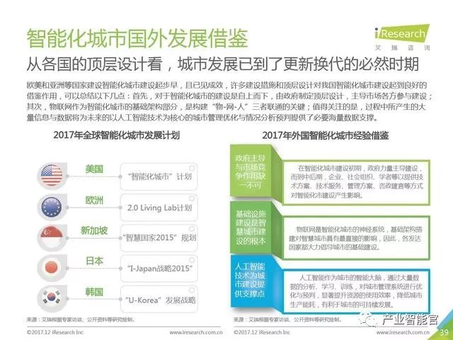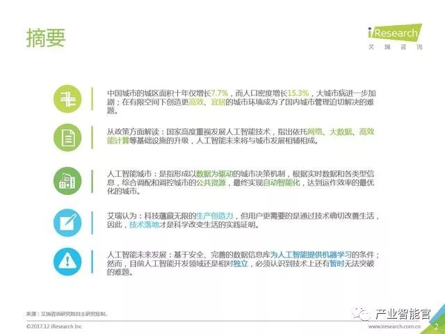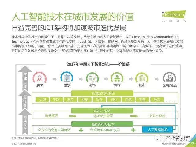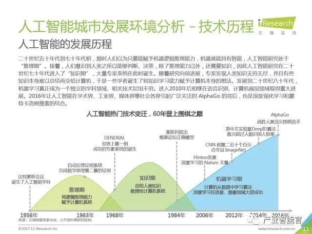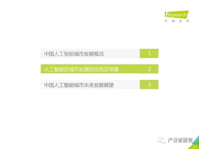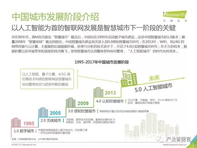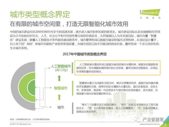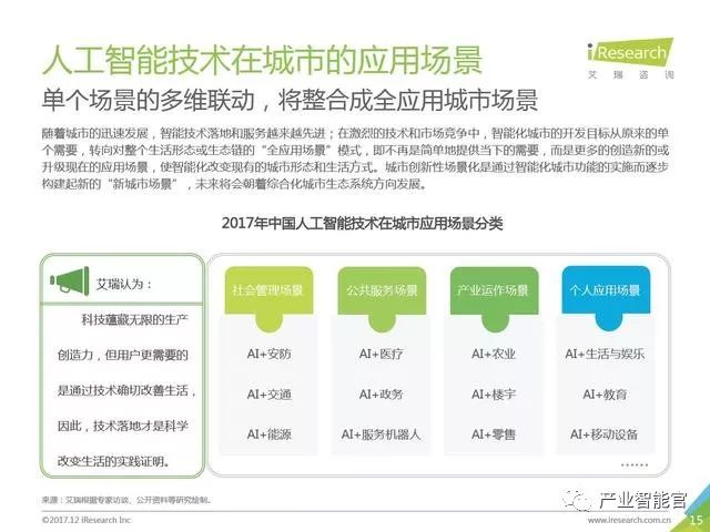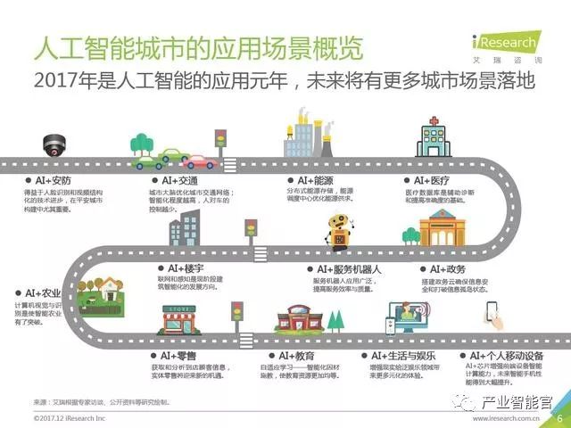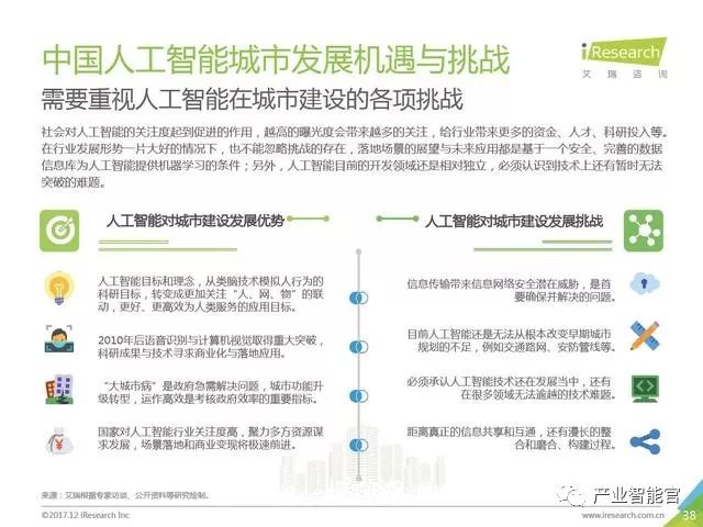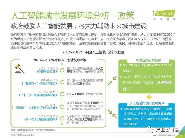 1月3日,艾瑞咨询发布《2017年中国人工智能城市展望研究报告》,报告显示,政府在近三年时间密集出台鼓励人工智能技术发展的政策,说明十分重视此次技术发展的机遇,从大力促成中国到2030年成为世界人工智能创新中心的决心可见,希望中国能够赶上这一次的技术革命,而不再仅仅是不掉队的要求。中国城市的政策方向则回归以人为本的核心,城市的发展都围绕着“高效、惠民、可持续发展”理念,让城市建设迎来转型升级的重大机遇。