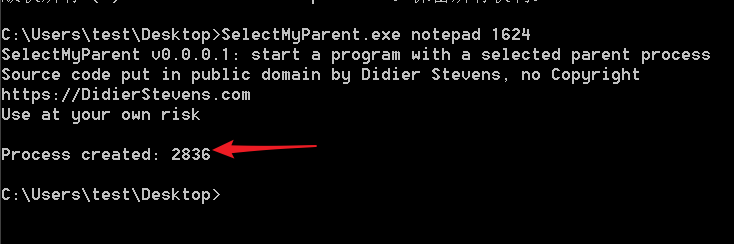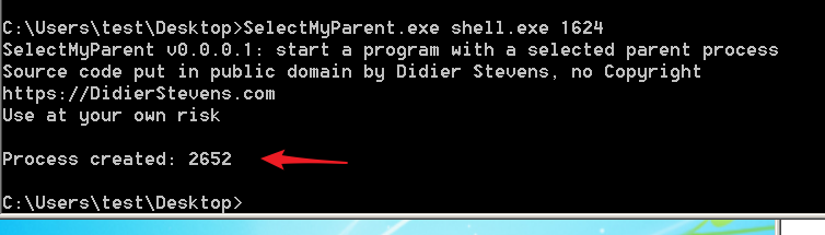 因此,要在这个父 explorer.exe进程下运行我们自己的二进制文件,可以像这样使用 SelectMyParent.exe,你会看到在 PID 1624下创建了一个新进程。