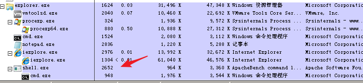 然后运行生成的shell.exe,并附属在explorer.exe的PID下