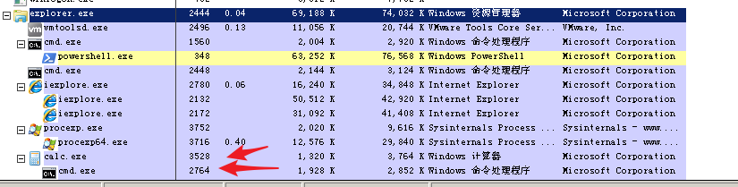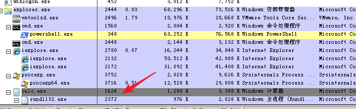 我们可以看到calc.exe在explorer.exe下,而shellcode则在calc.exe中执行。