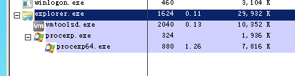 在进程管理器中,你会看到 explorer.exe 在 PID 1624 上运行