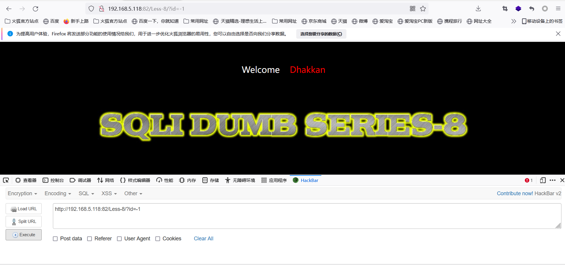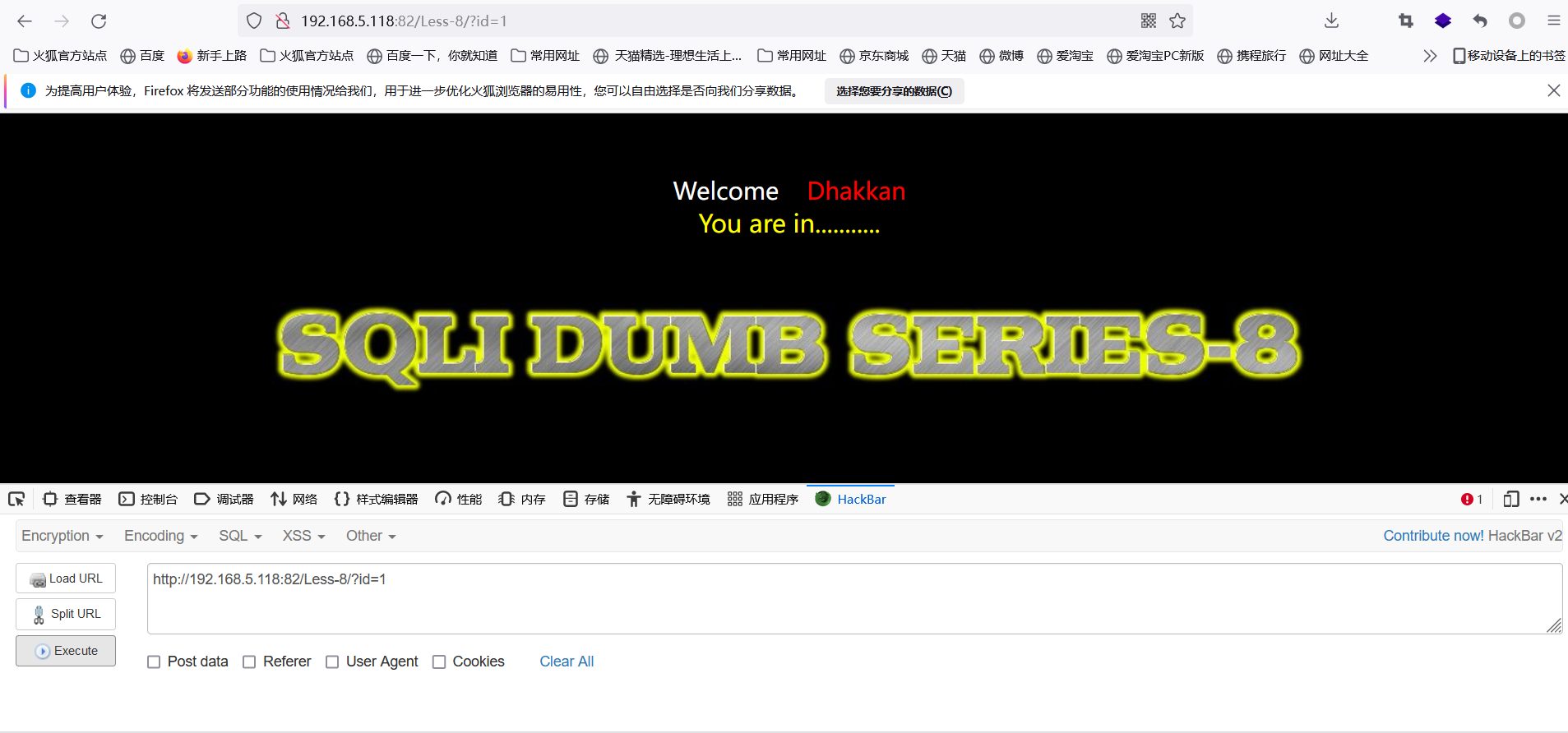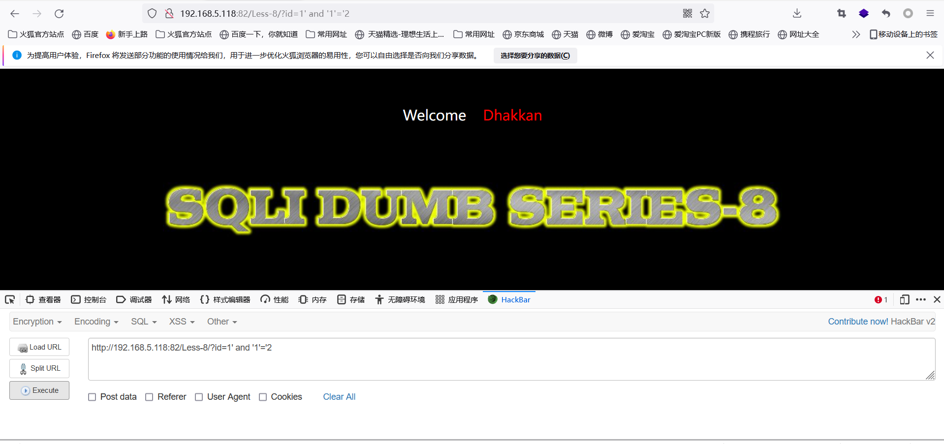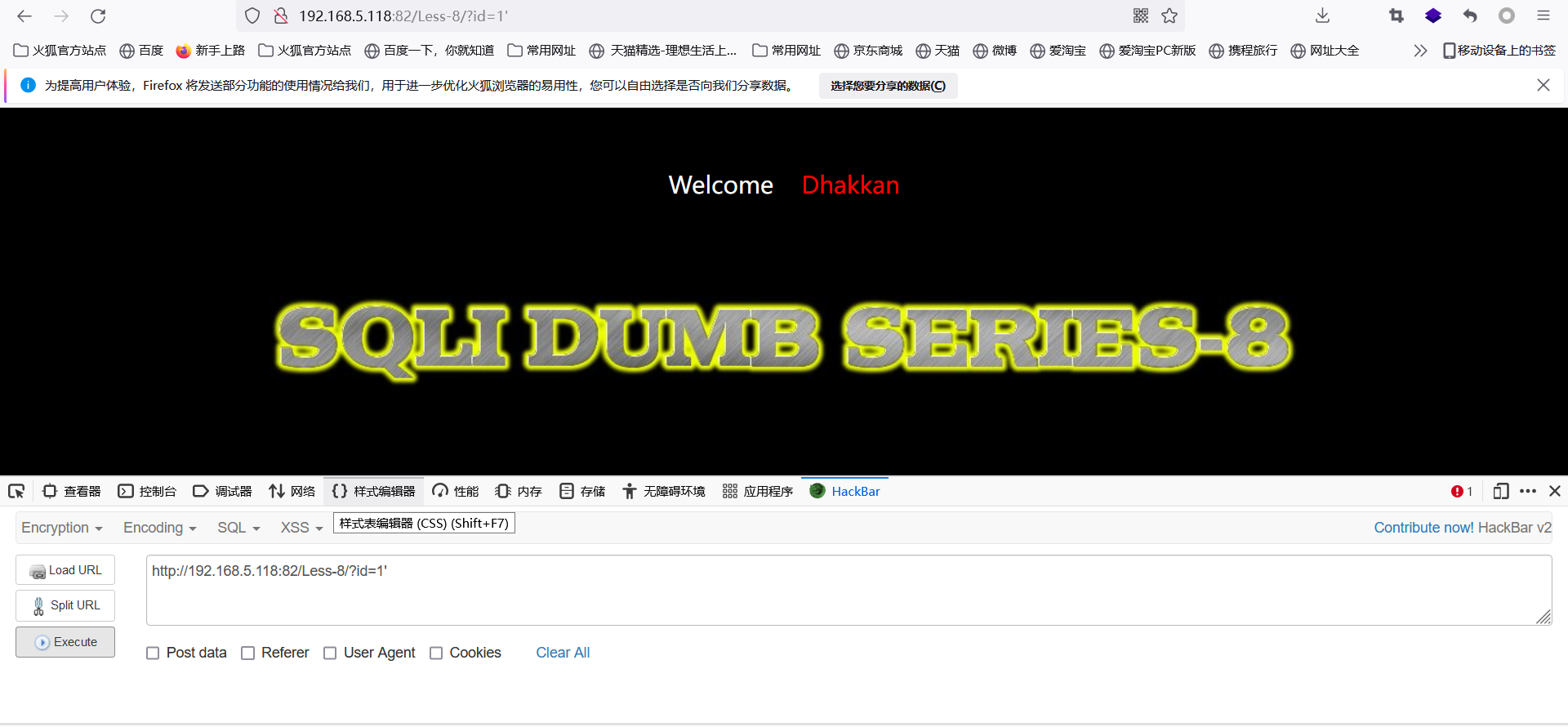 在攻击机Pentest-Atk打开FireFox浏览器,并访问靶机A-SQLi-Labs上的SQLi-Labs网站Less-8。访问的URL为: