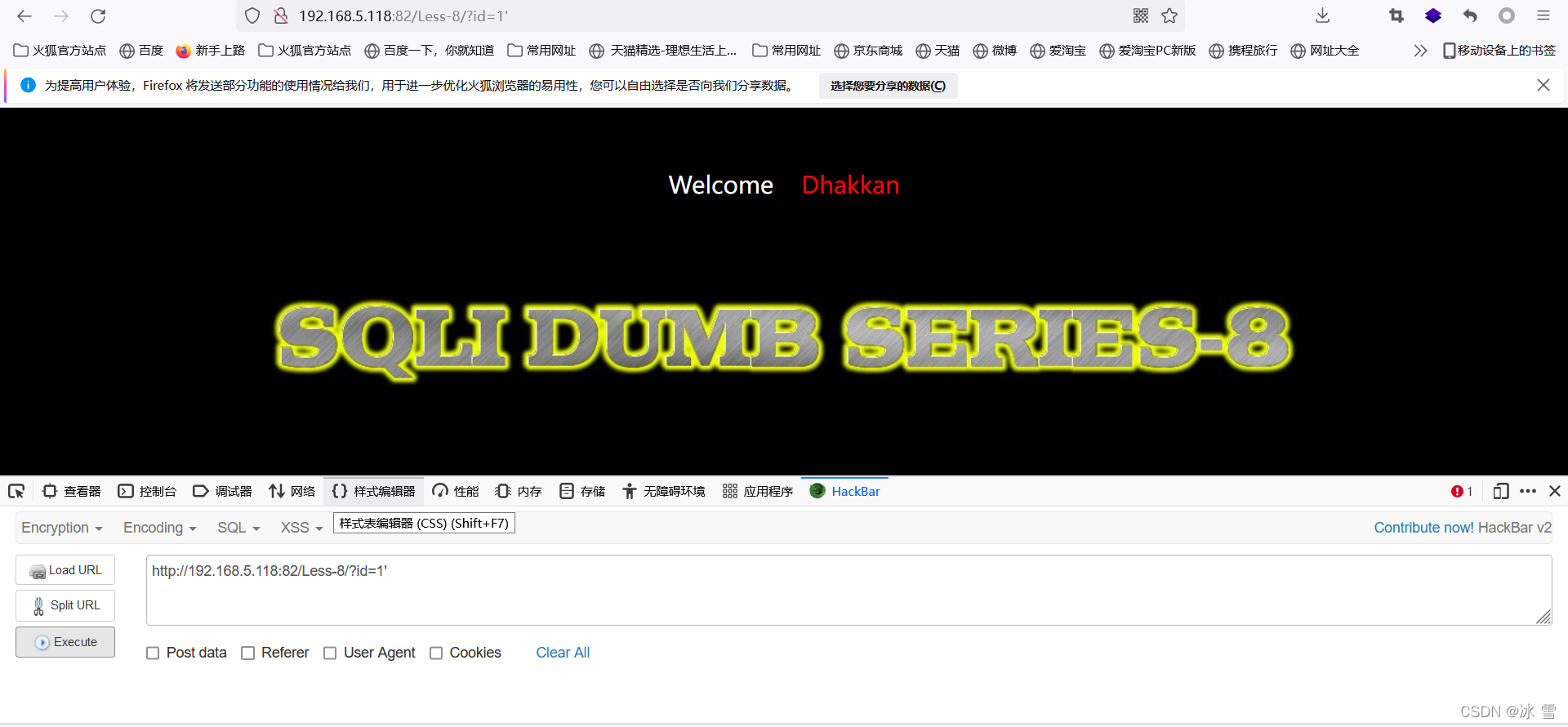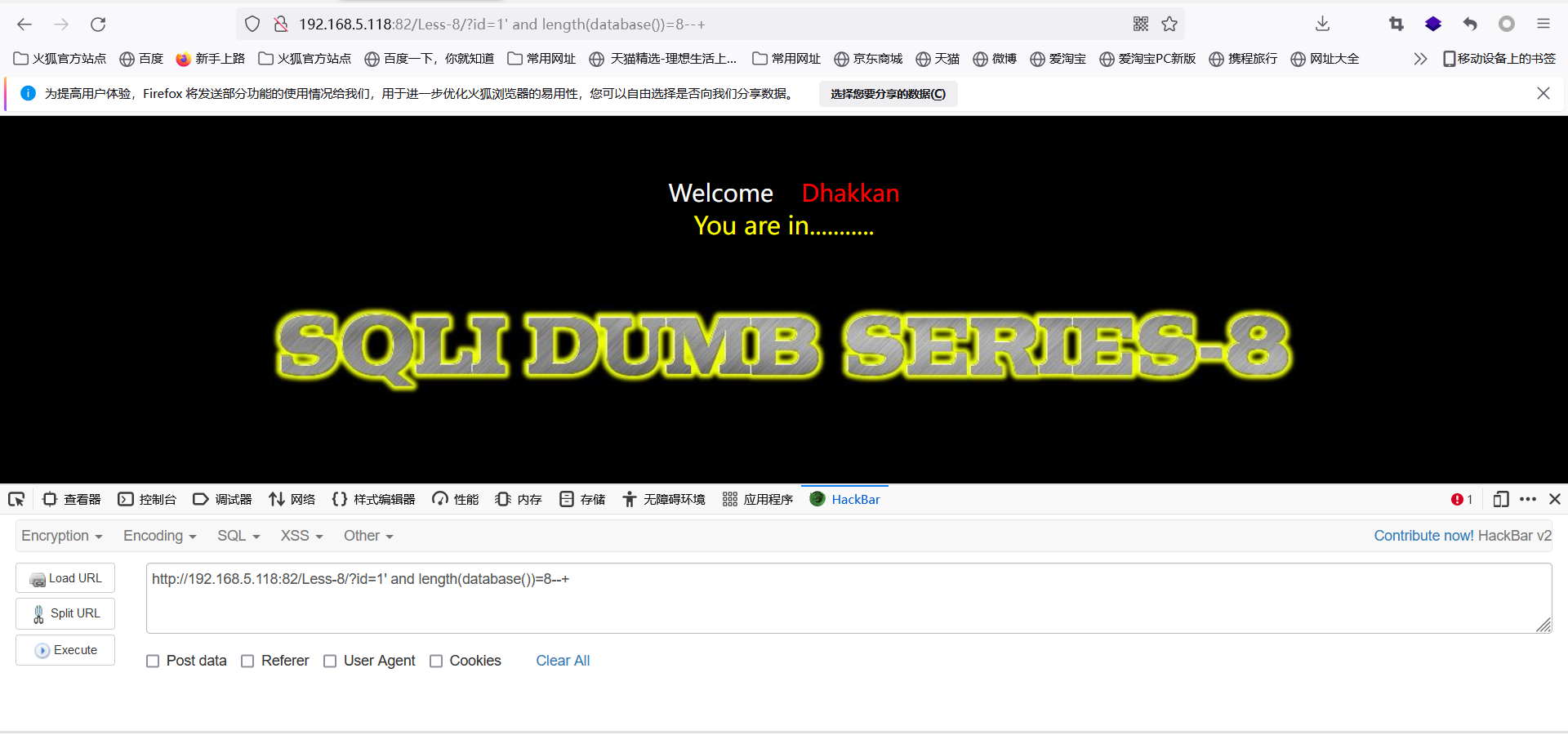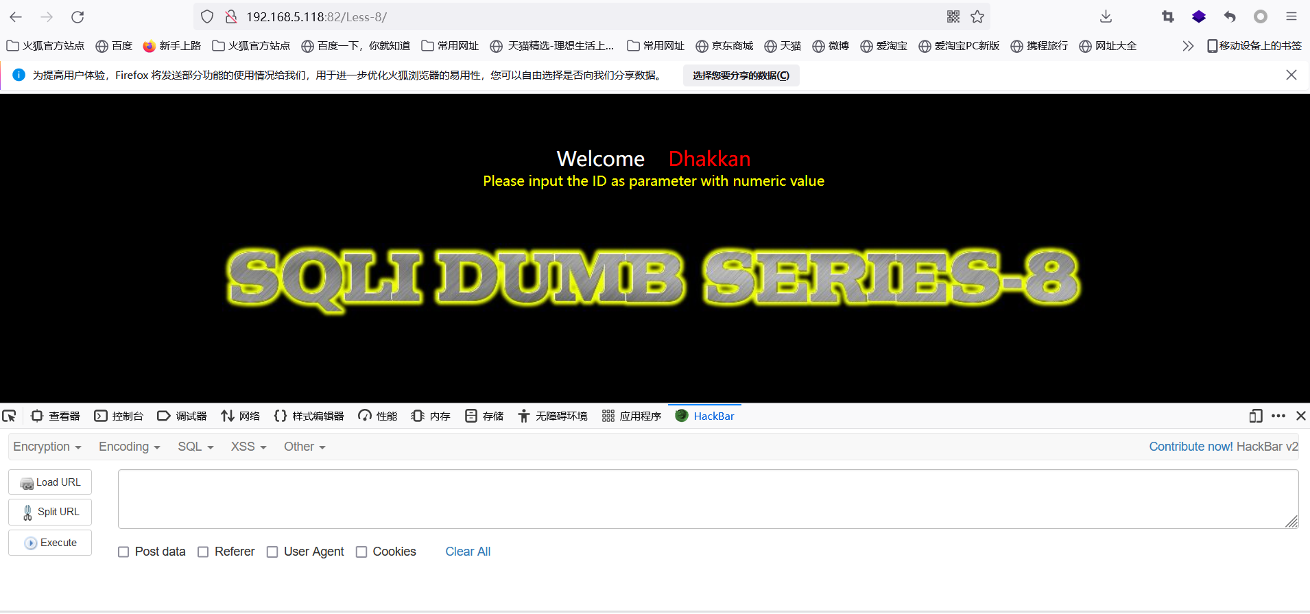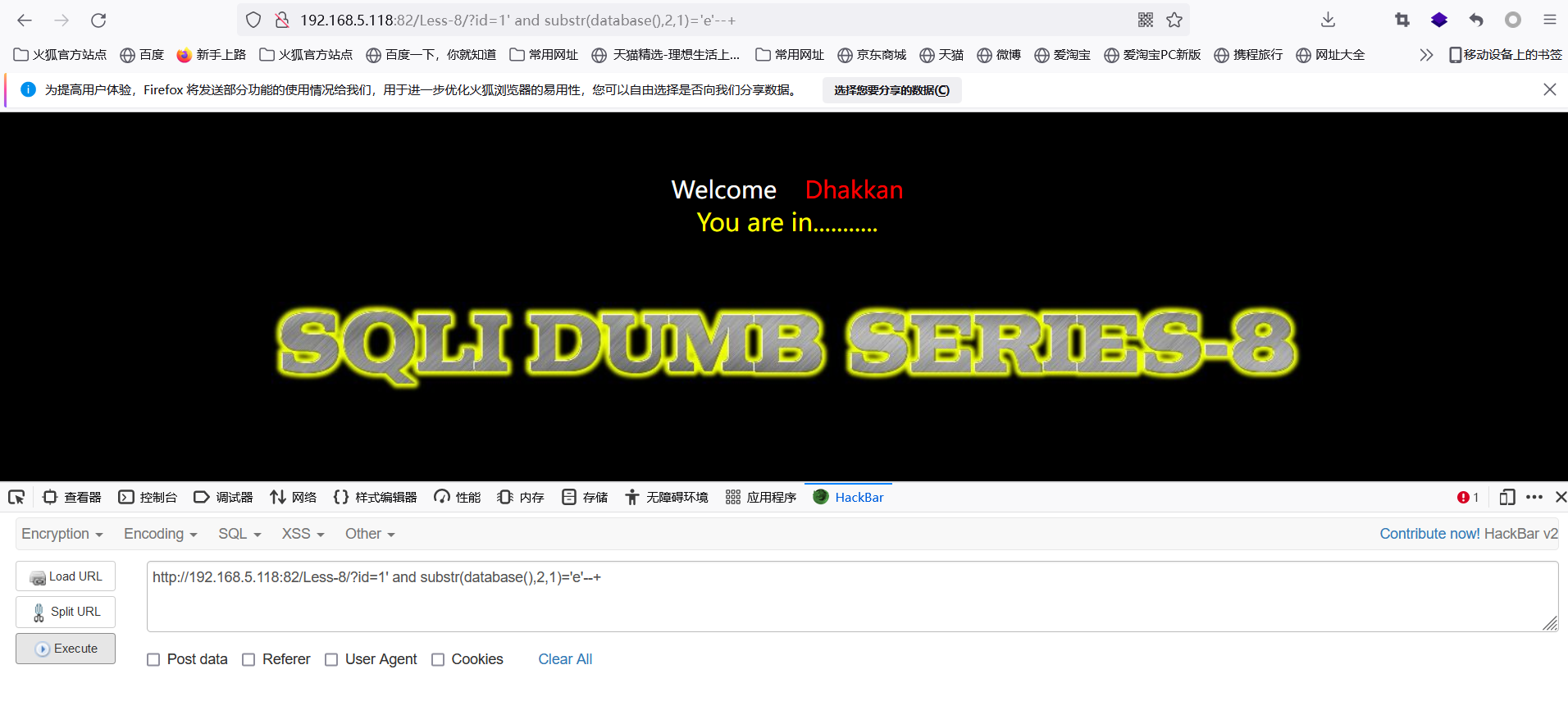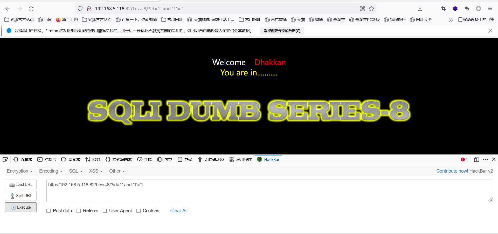 在攻击机Pentest-Atk打开FireFox浏览器,并访问靶机A-SQLi-Labs上的SQLi-Labs网站Less-8。访问的URL为: